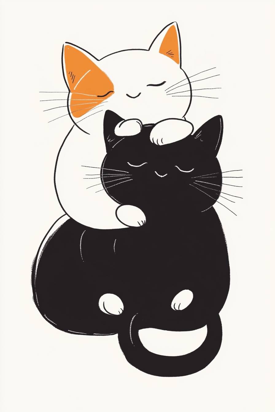 Стиль художника Ёниу Чхоя, простой линейный рисунок, мультфильм, жирные контуры, черно-белый котенок и оранжево-белый котенок, серебристо-черная хомячка, черно-белый кот, сложенный вместе, мило и трогательно, исцеляющий стиль искусства, минимализм, чистота, яркие цвета и может включать серию небольших наклеек.