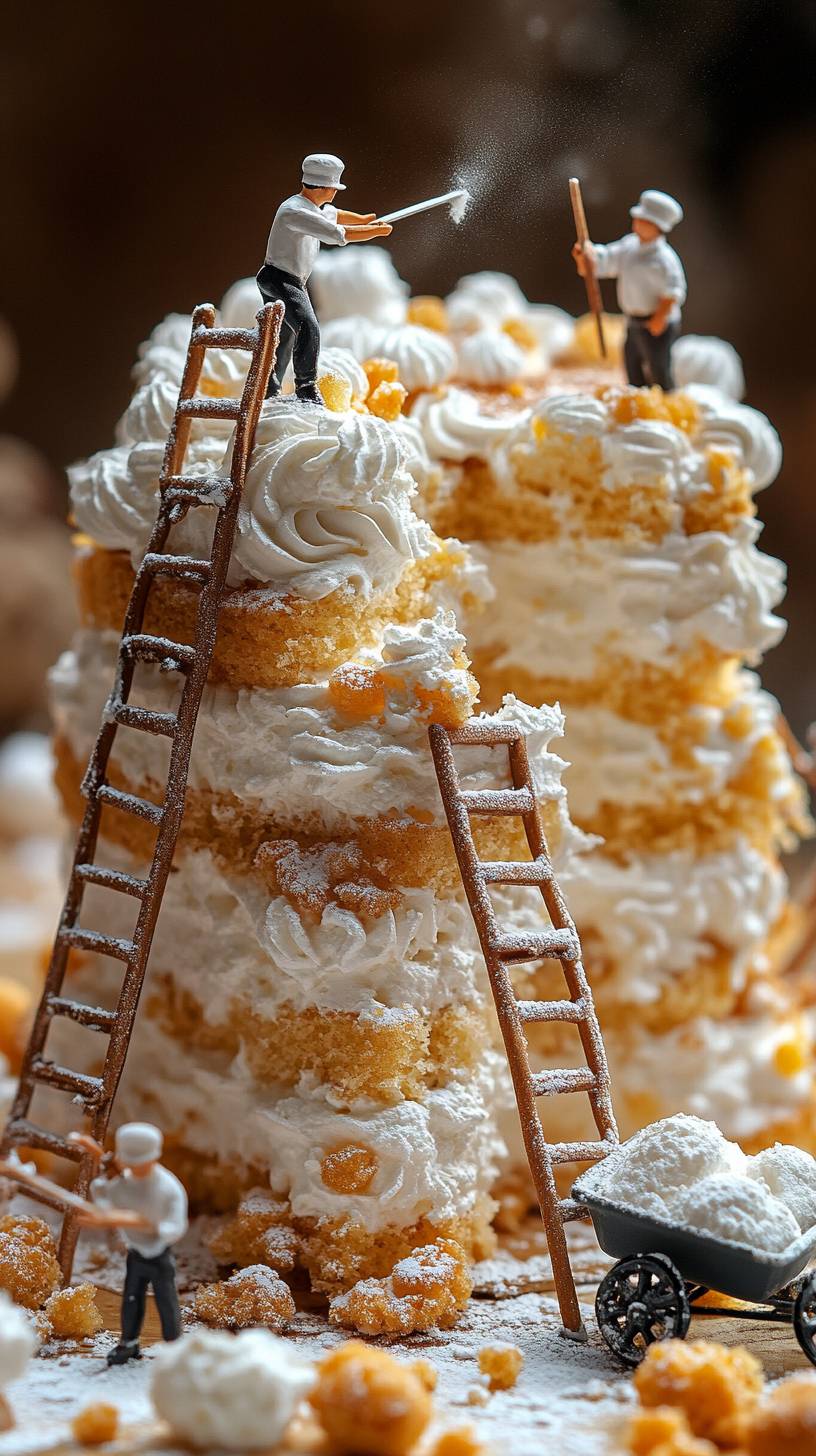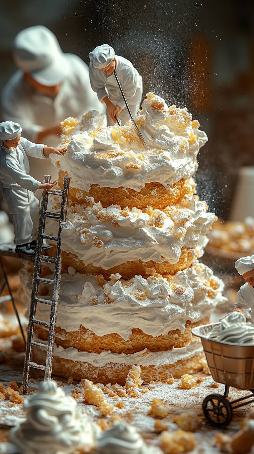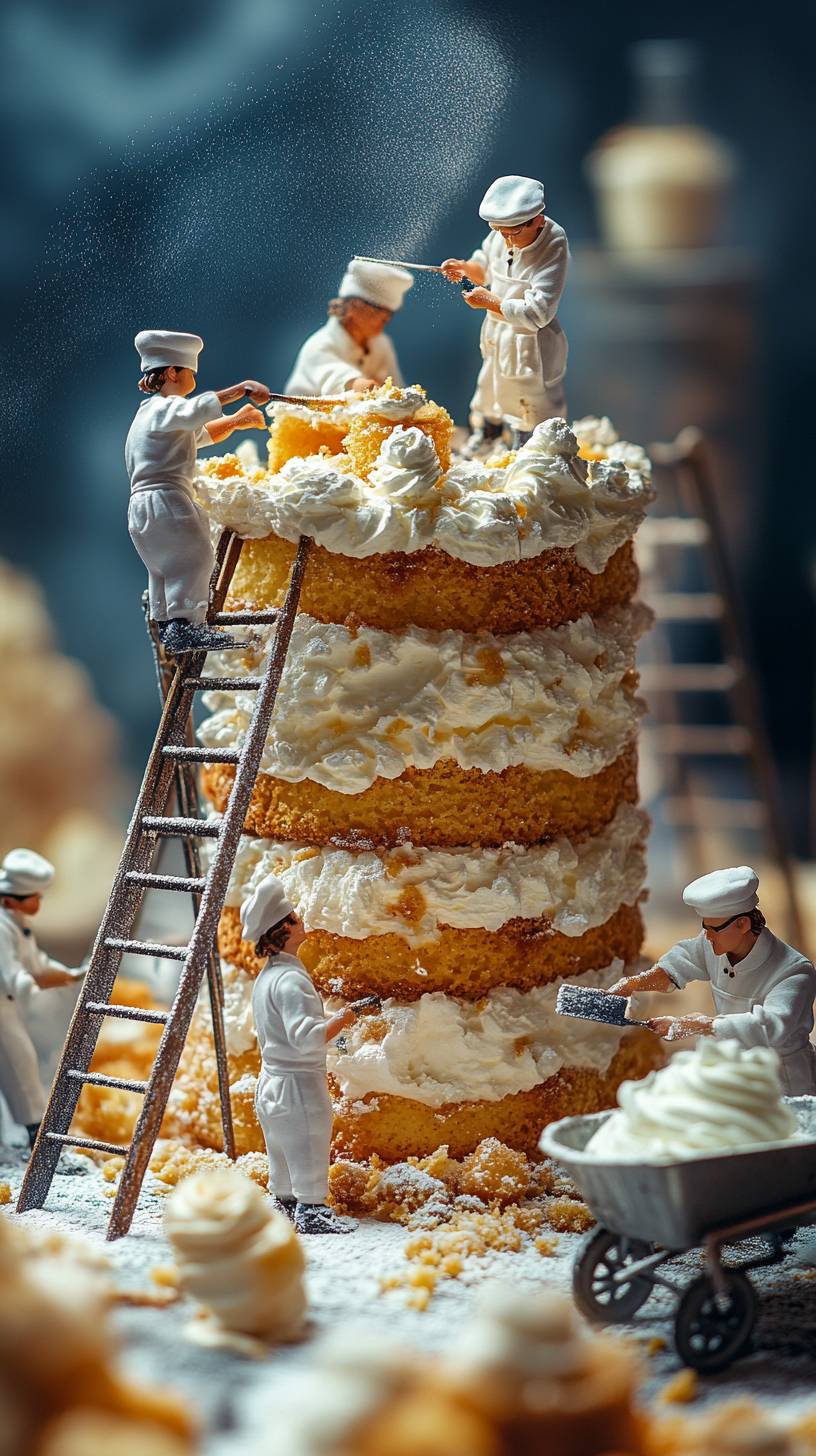 Tiny pastry chefs constructing the base layer of a giant sponge cake | scaffolding and ladders surround the cake | one chef smoothing the surface with a painter’s trowel | another chef measuring the layer with a ruler | a wheelbarrow carrying whipped cream | miniature powdered sugar shakers dusting the scene | tilt-shift photography | realistic depth of field | warm and inviting lighting --ar 9:16 --style raw --stylize 650 --v 6.1