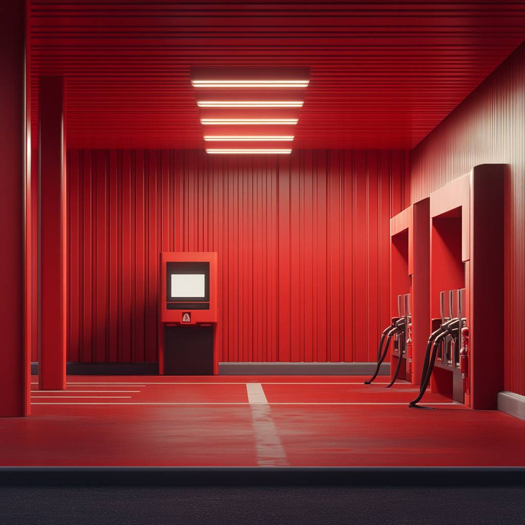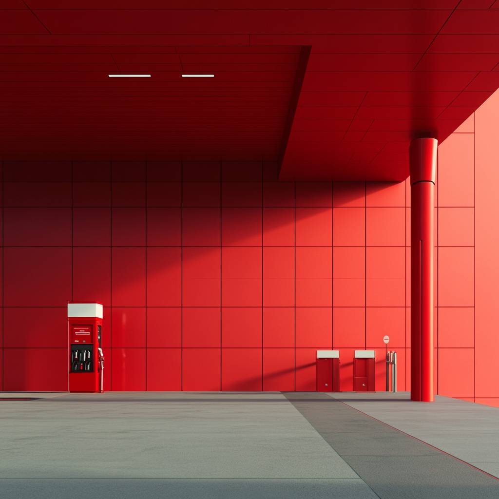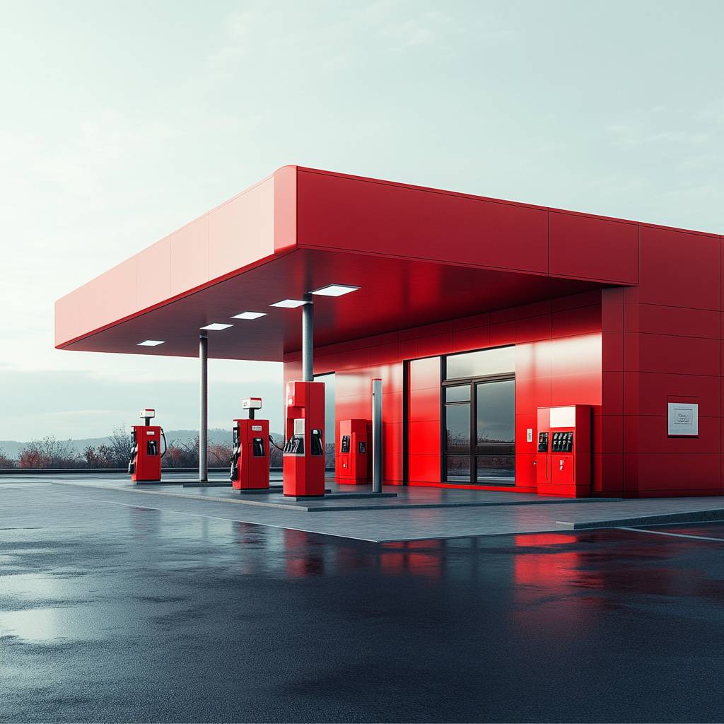 Modern minimalistic petrol auto gas station of red color. We see an empty space next to the gas stand. Clowe up. There is no one at the gas station. The background is minimalistic. Ultra-detailed, photorealistic textures, cinematic lighting, 8K resolution, trend on ArtStation --v 6.1