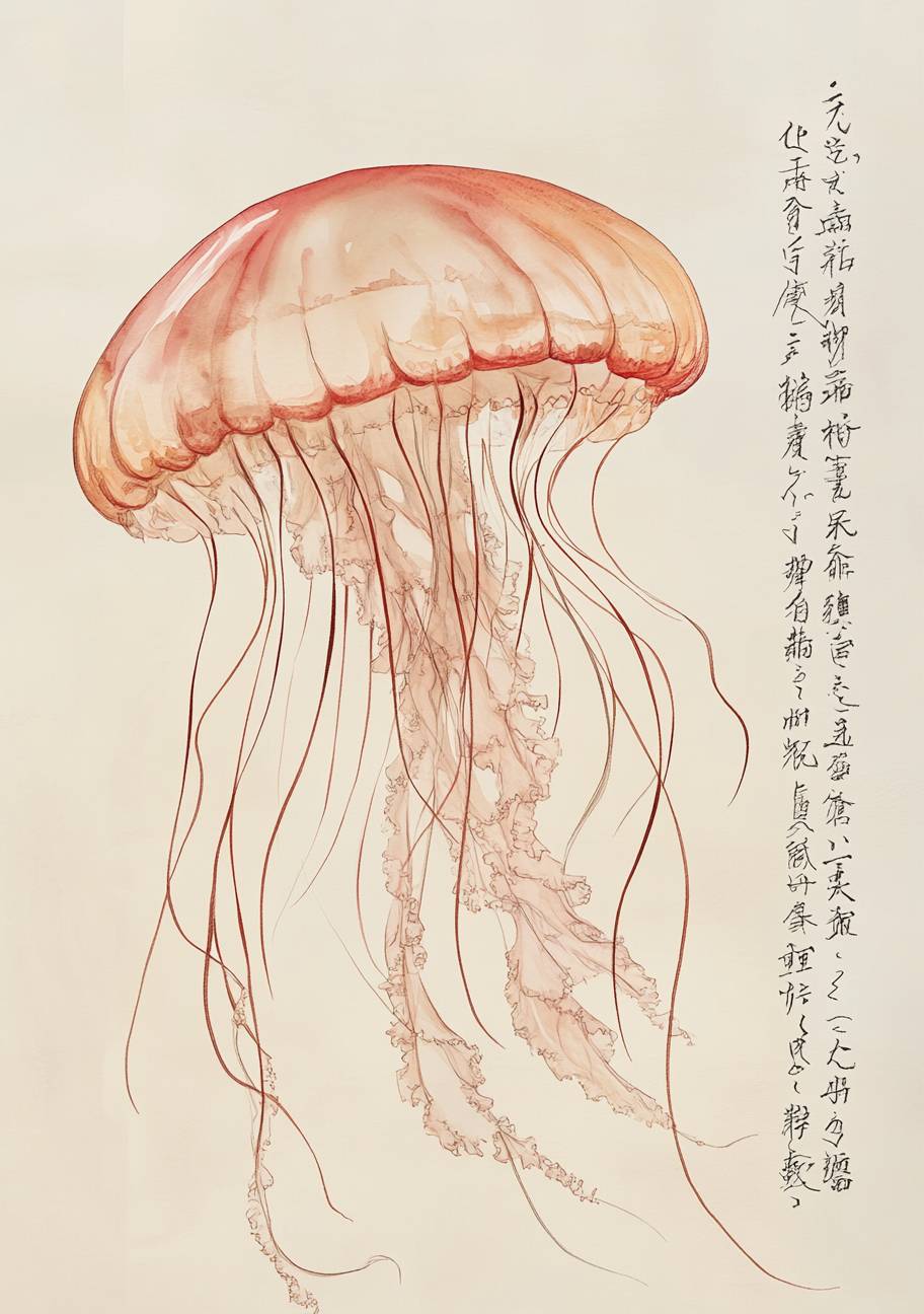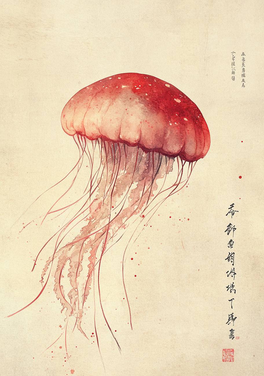 Плавающий, эфирный медуза, изображенный в традиционном японском акварельном стиле. Его полупрозрачные щупальца нарисованы элегантными, плавными мазками, а ограниченная цветовая палитра красного и бежевого добавляет простоты. Японская каллиграфия обеспечивает баланс композиции.
