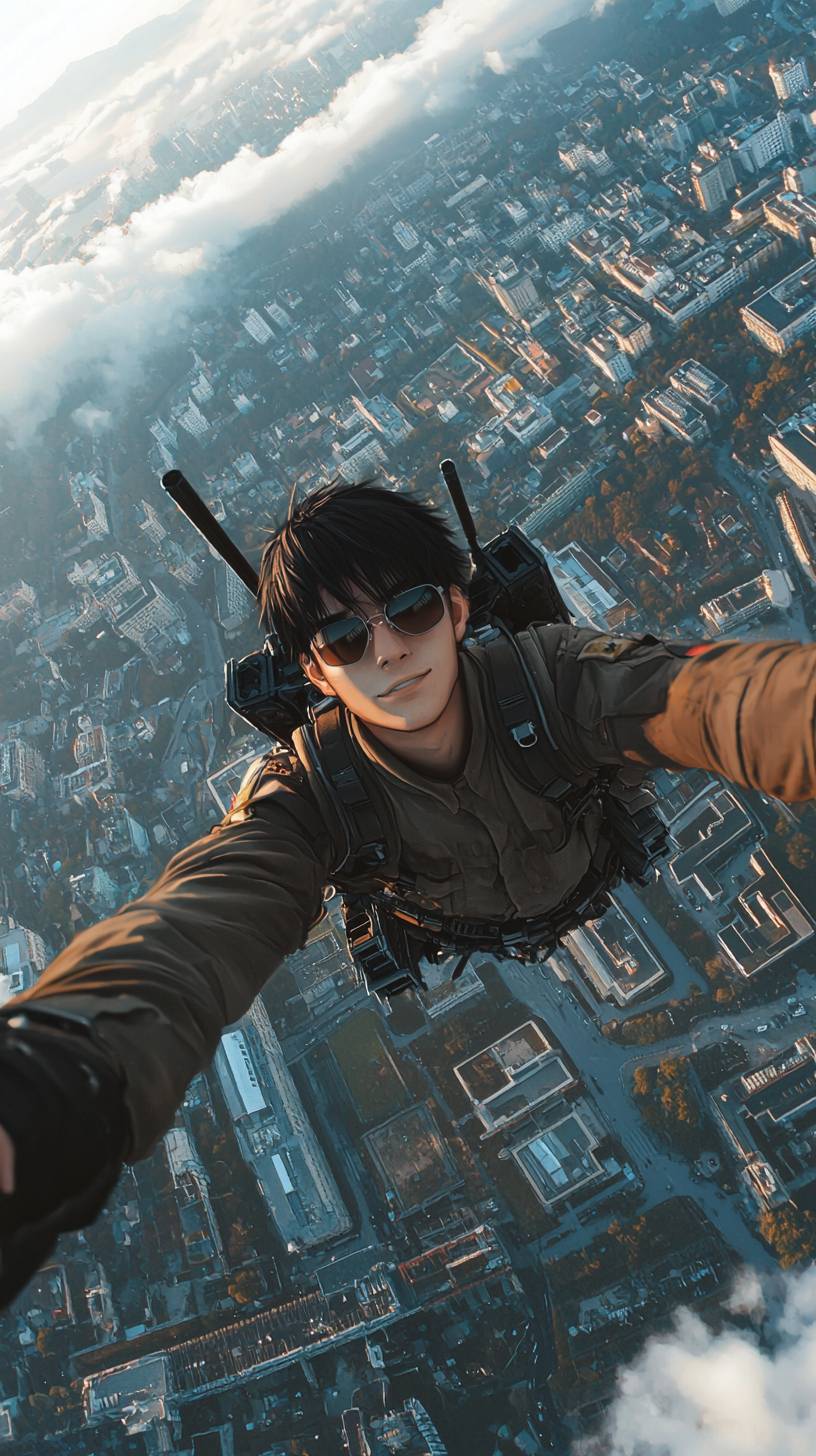 Селфи Эрен Яегера. В одежде ODM. Находится в воздухе над городом Шиганшина из 'Атаки титанов'. Аниме-стиль, вдохновленный мангой Хадзимэ Исаямы.
