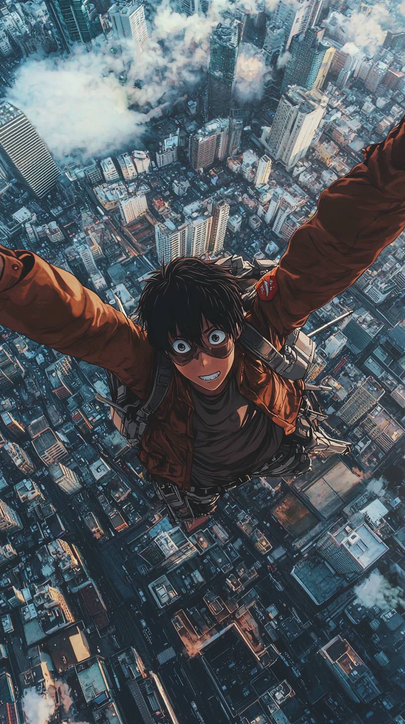 Эрен Йегер делает селфи в воздухе, одетый в ODM-оборудование над городом Шиганшина из «Атаки титанов».