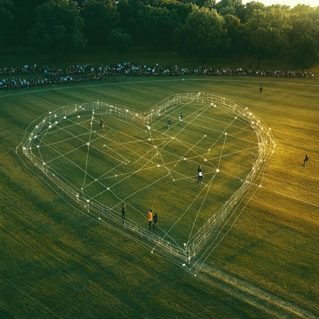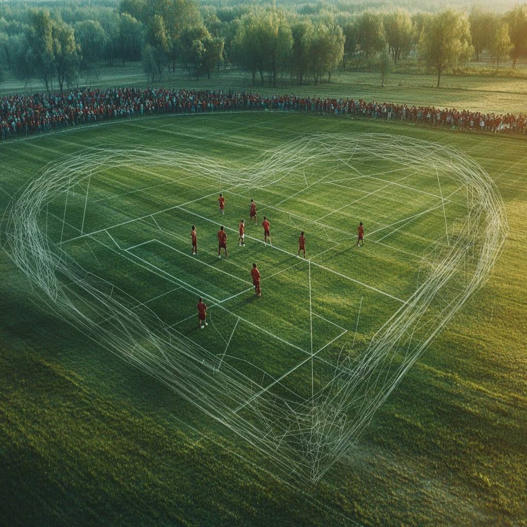 Сердцевидное футбольное поле на закате, где молодые игроки радостно тренируются, тренер направляет их с восторженным выражением, теплый свет подчеркивает связь между игроками и игрой. Атмосфера вдохновляющая, наполненная движением и энергией, символизирующая любовь, страсть и наставничество в спорте. На фоне можно увидеть тонкий цифровой налет, представляющий идеи тренерства на базе ИИ от FourCorners, сочетая технологии и человеческую страсть. Ярко, киношно, трогательно. На заднем плане больше людей, смотрящих и поддерживающих. Вдоль окружности скамейки больше мест, возможно, даже очень маленькая местная команда.