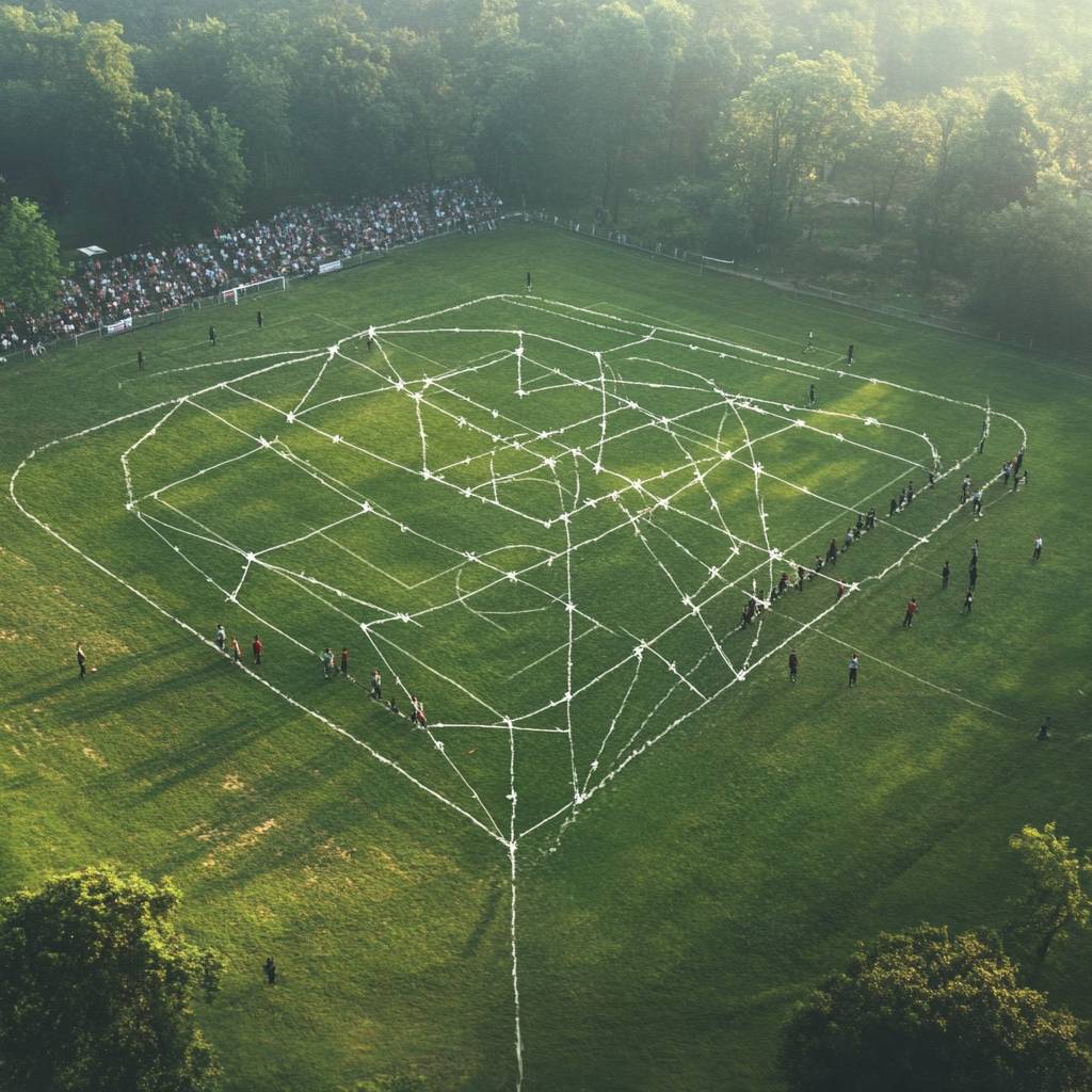 На закате молодые игроки радостно тренируются на сердцеобразном футбольном поле, их страстно направляет тренер, олицетворяя любовь и наставничество в спорте.
