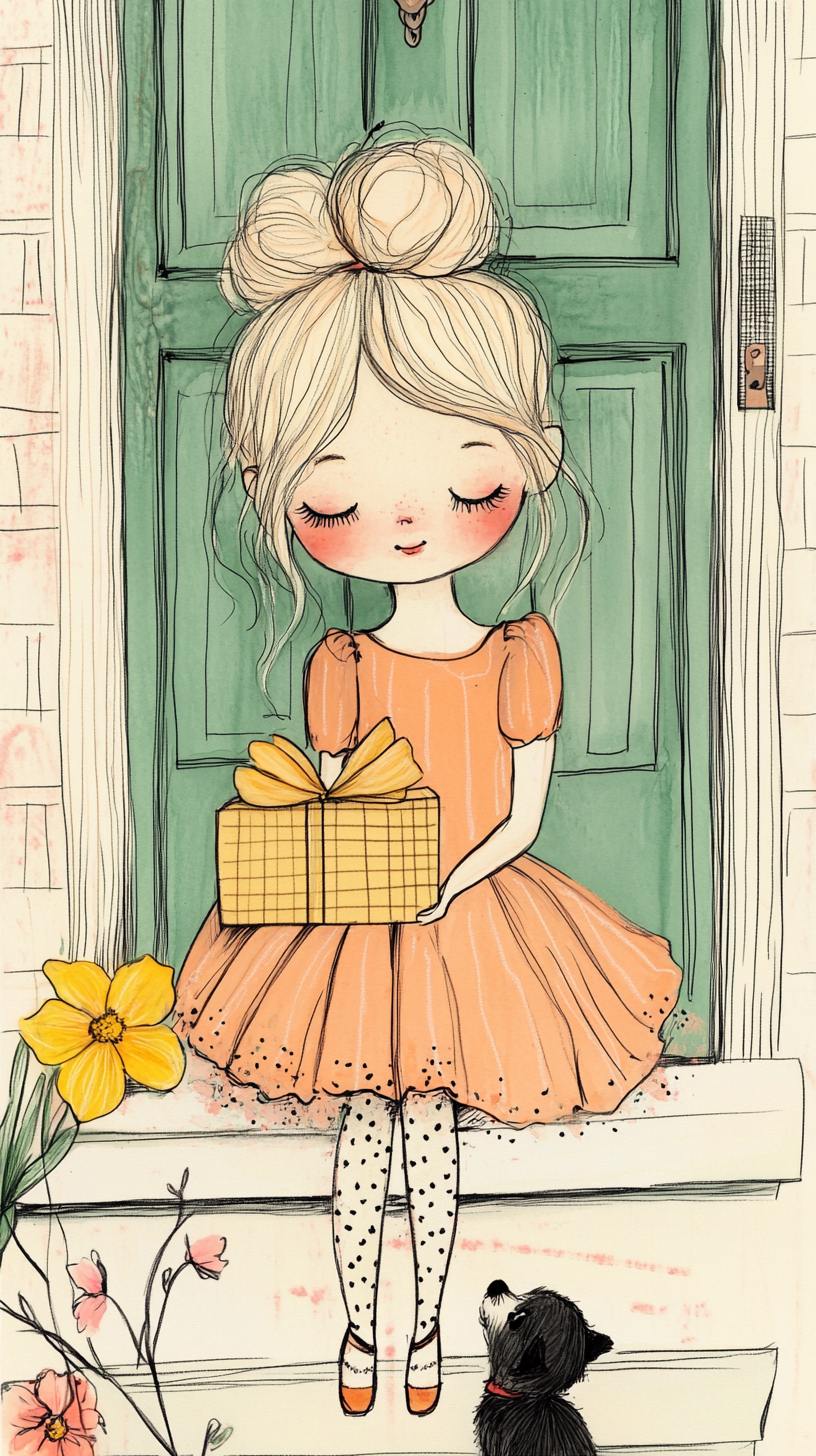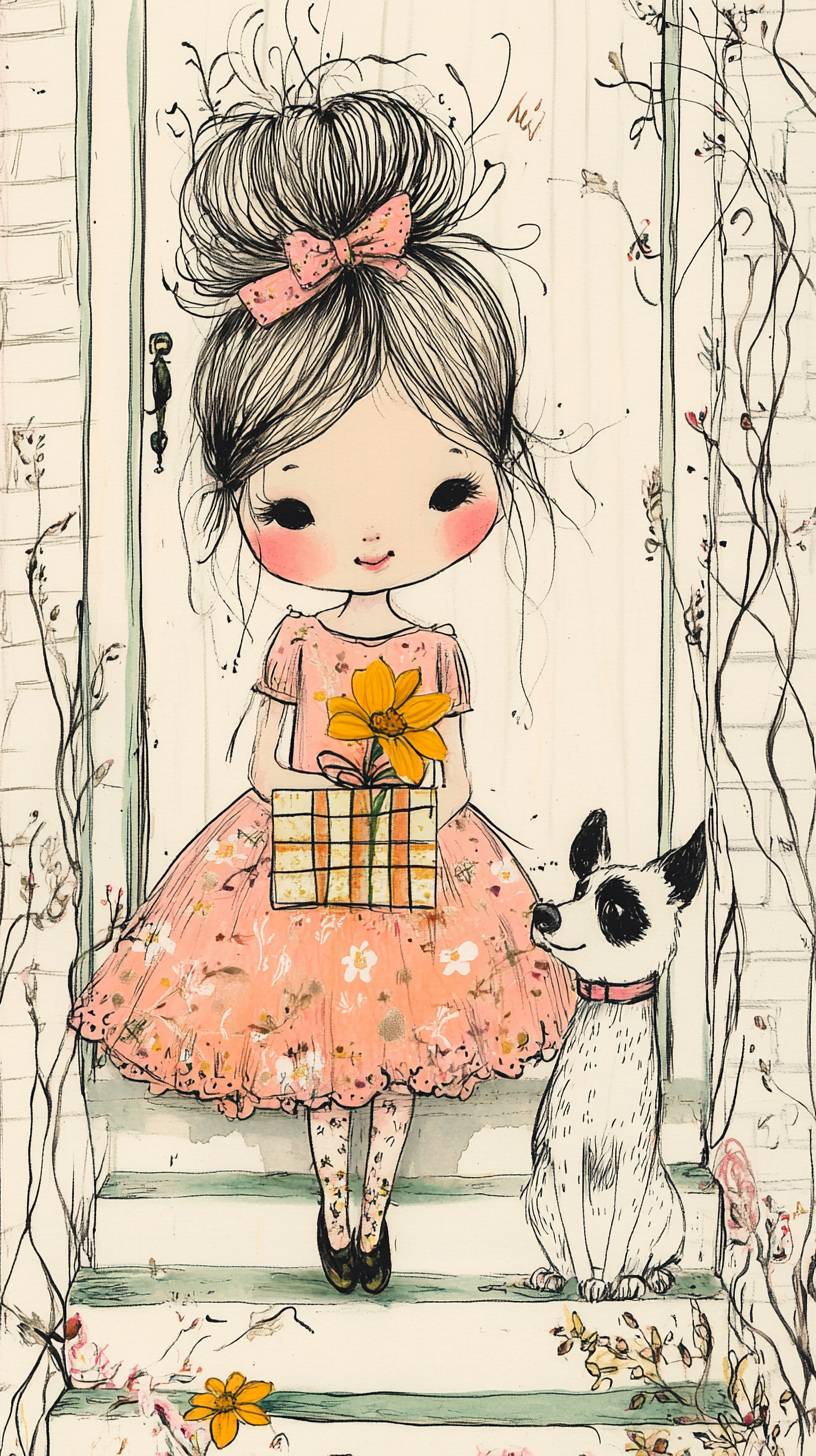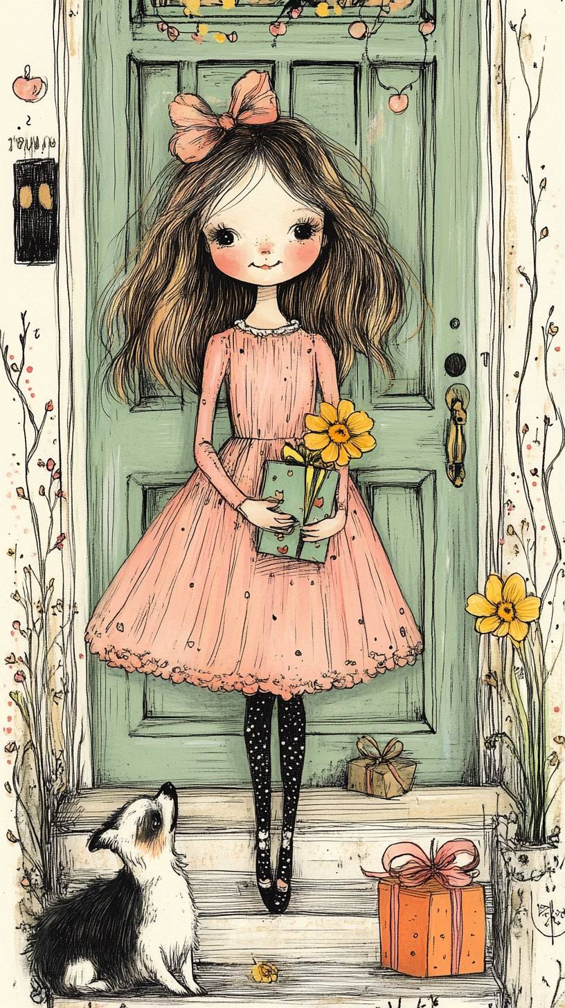 In the enchanting styles of Nicoletta Ceccoli and Molly Harrison, a girl joyfully perched on the steps of a historic Victorian building in the Bronx, celebrating her birthday amidst lush greenery, holding a vibrant yellow daffodil, with a playful terrier by her side, a beautifully wrapped present on the step --ar 9:16 --style raw --sref 3841769590 --stylize 350 --v 6.1