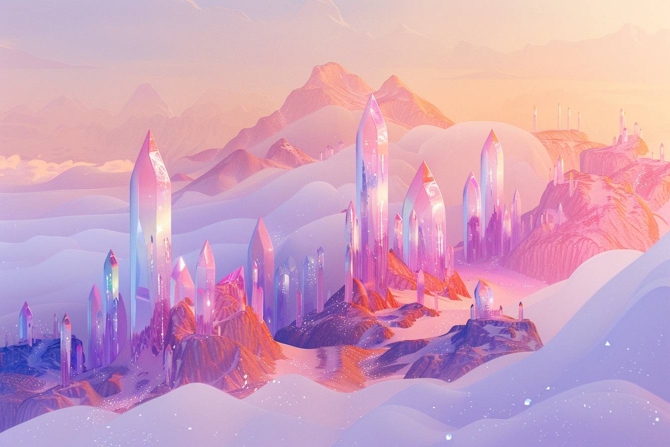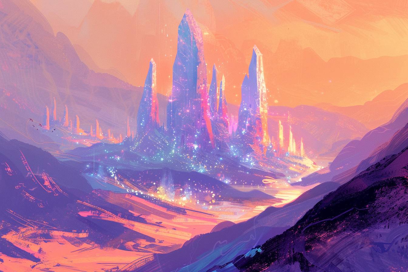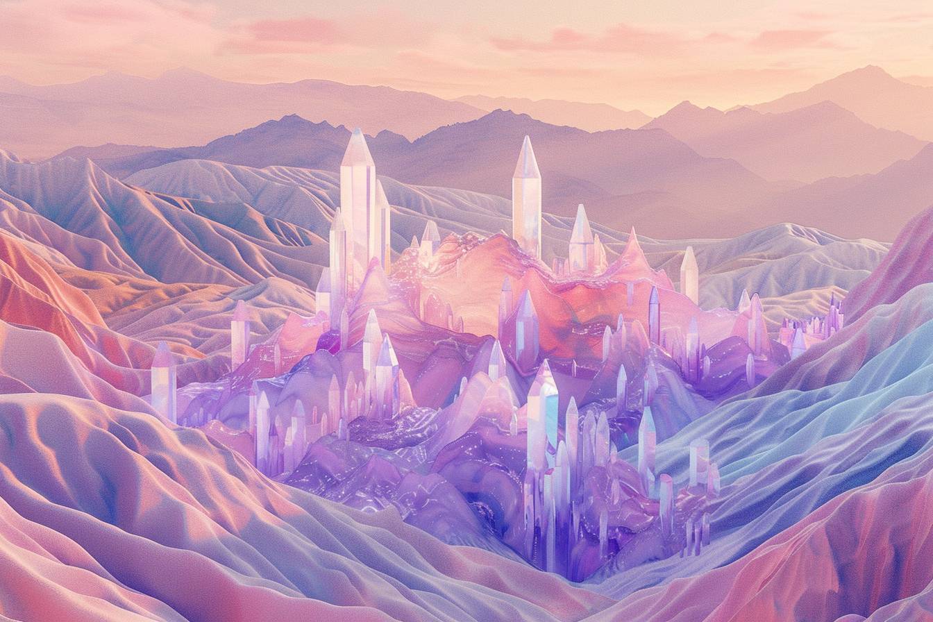 Фантастический, словно из сна, пейзаж с цветовым переходом от нежного персикового к лавандовому, с холмами и высокими кристальными шпилями.