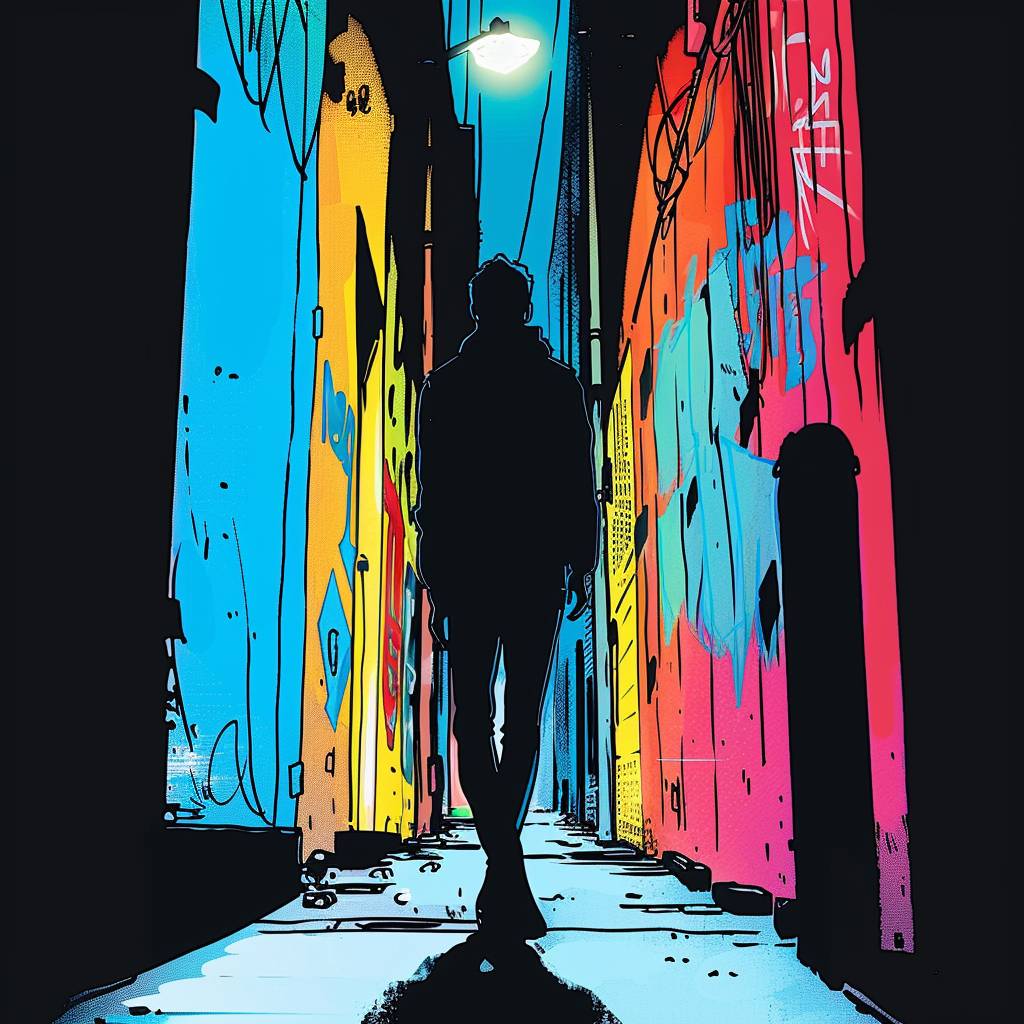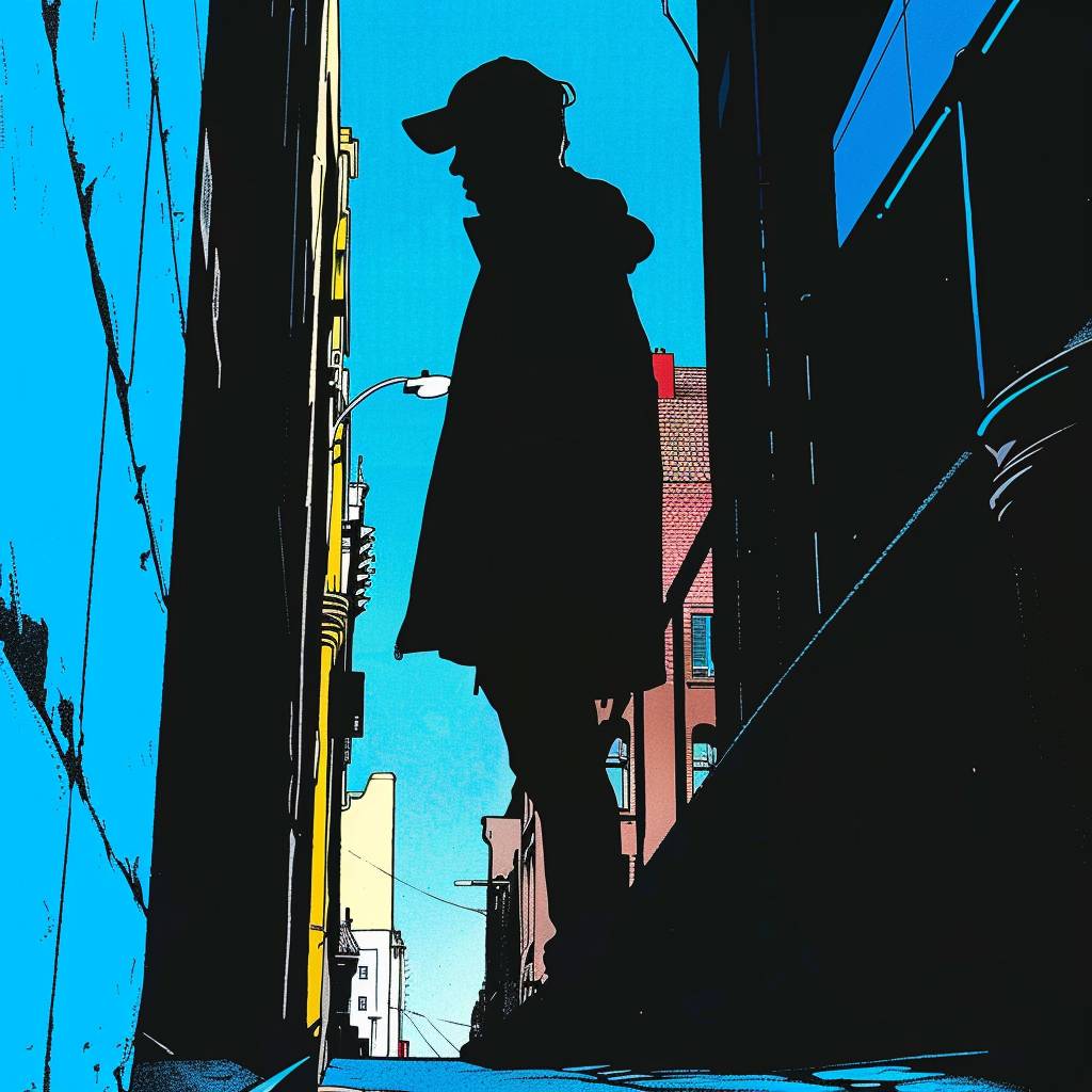 A silhouette of a person standing under a streetlight in a dark alley, with dramatic shadows and monochromatic tones --sref 1738164590 --v 6.0