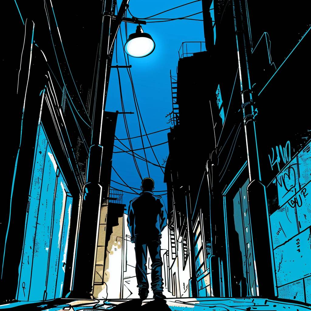 Силуэт человека, стоящего под уличным фонарем в темном переулке, с драматическими тенями и монохромными тонами.