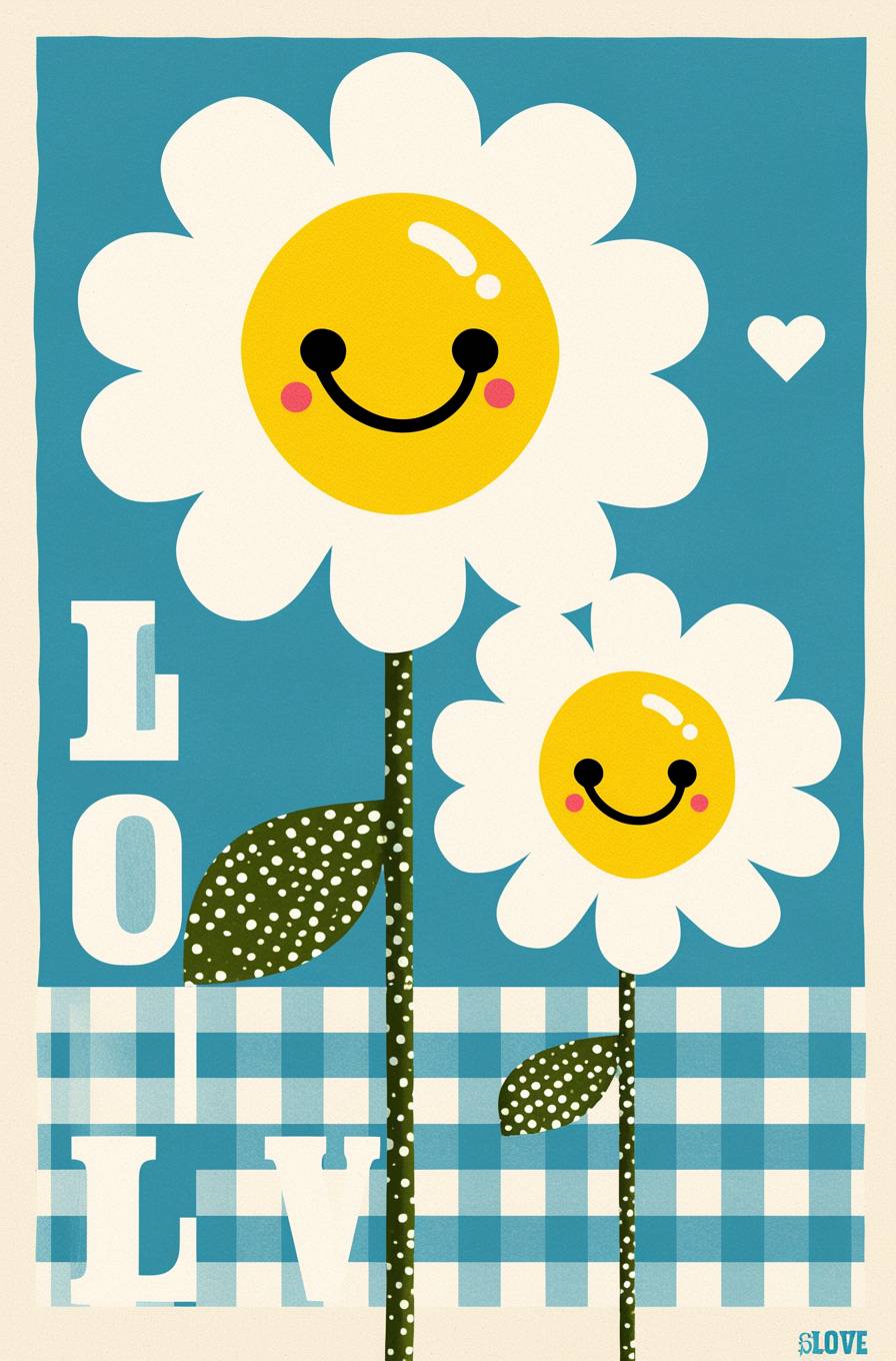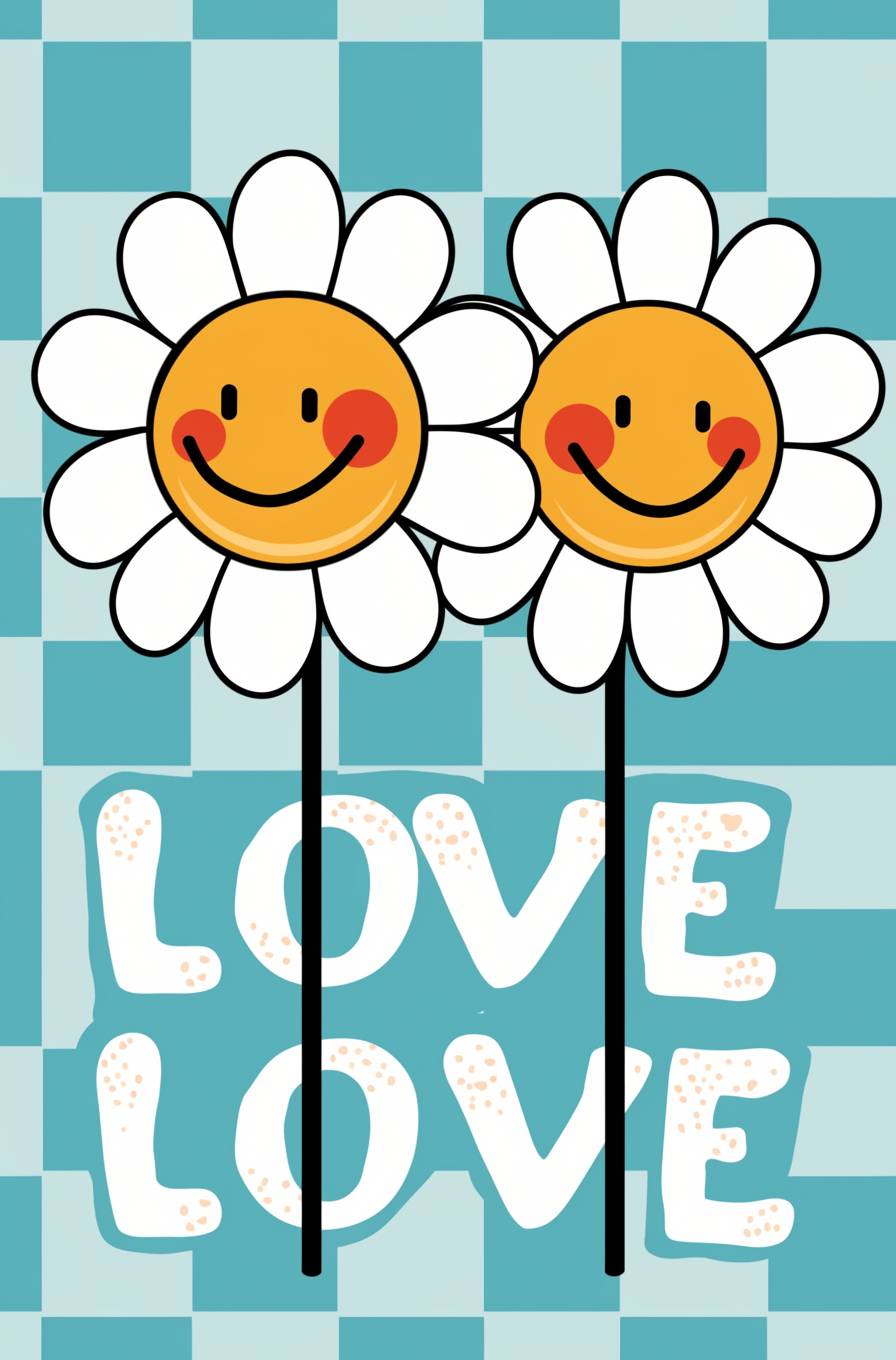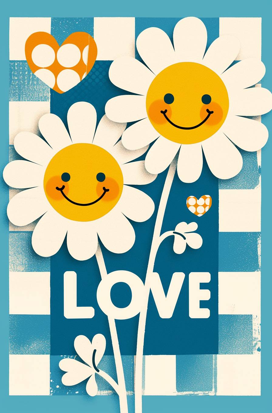 A groovy poster of two happy daisies with smiley faces, designed in the style of vintage psychedelic posters and cut-and-paste illustrations, featuring bold typography that says "LOVE". The background is a checkered pattern of blue and white, with a 1970s aesthetic. --ar 53:80 --niji 6 --style raw