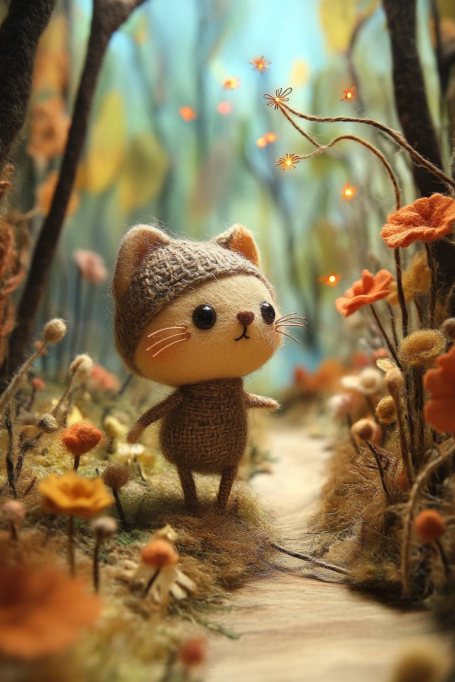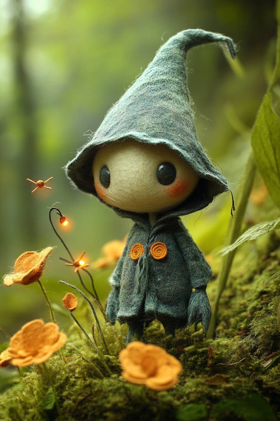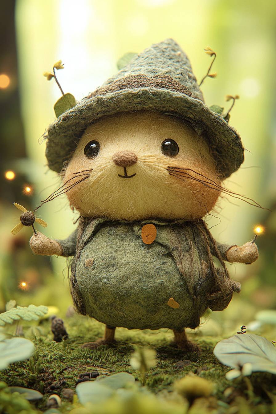 Пухлый [subject] в комкнутой [color1] шляпе неуклюже гонится за [color2] светлячками на поляне из войлока и бумаги. Текстурная эстетика покадровой анимации с видимыми отпечатками пальцев и мягкими текстурами ткани.