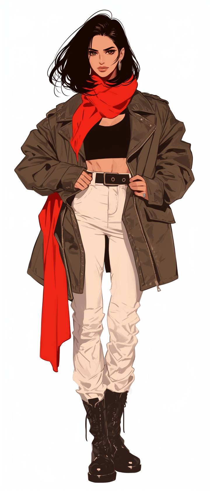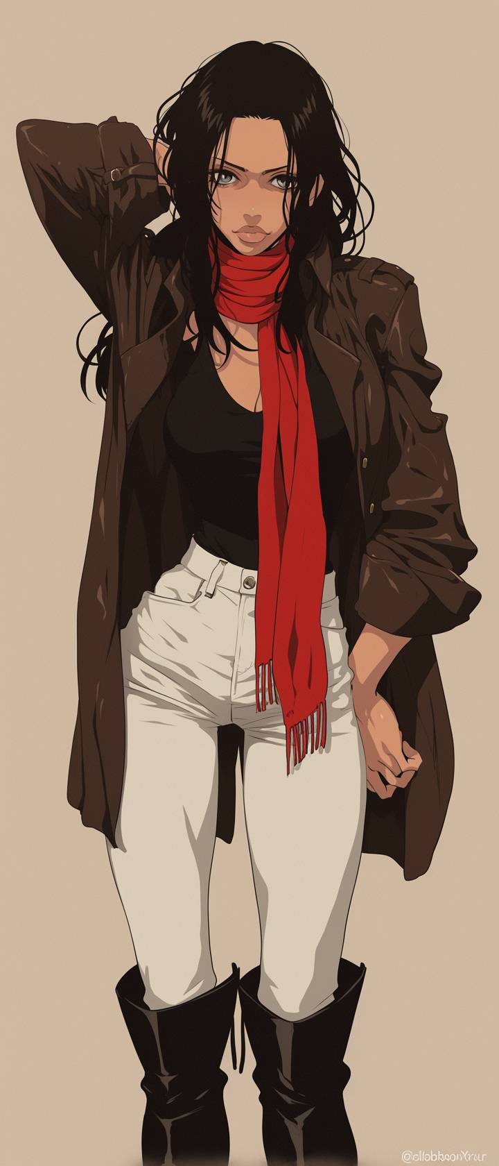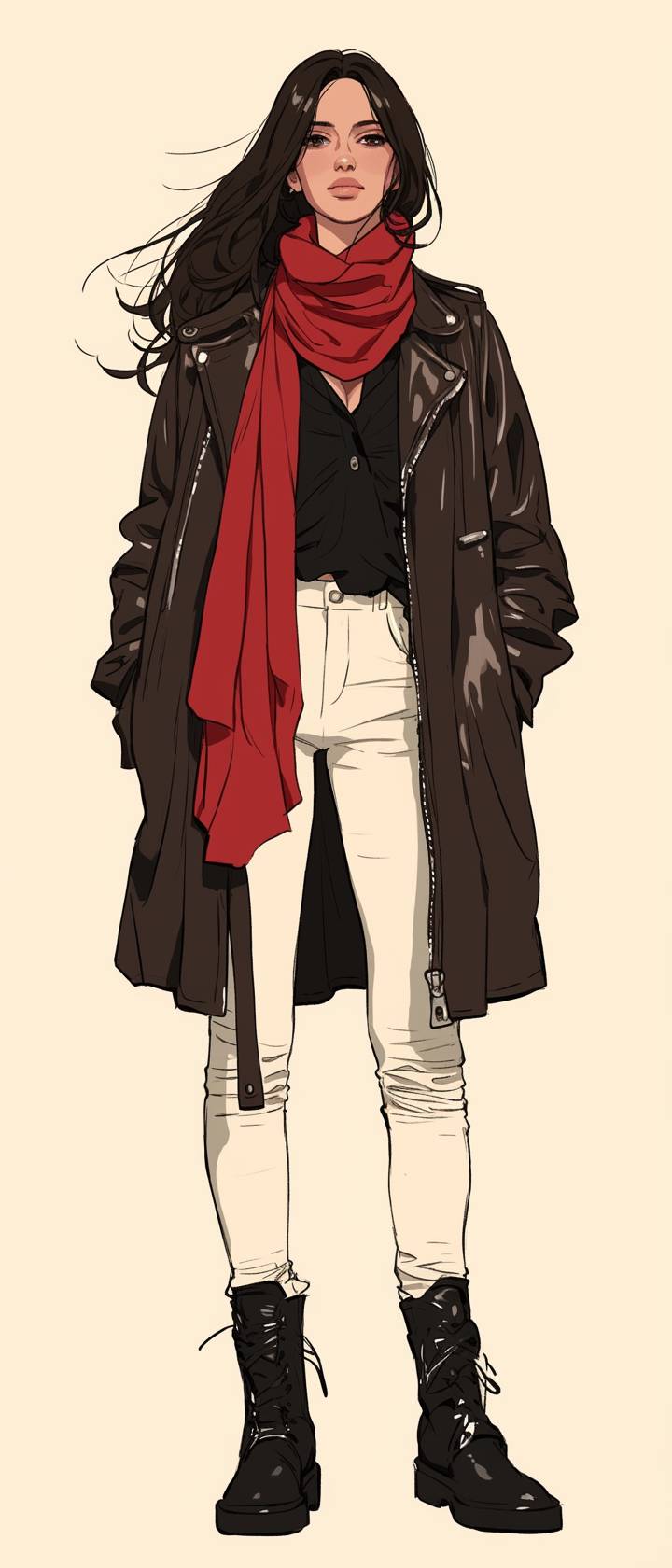 Зои Кравиц, косплейщица Микасы Аккерман из Атаки Титанов, минималистская иллюстрация линейного искусства, в полупрозрачной черной блузке Saint Laurent, красном кашемировом шарфе, темно-коричневой кожаной куртке, белых брюках с завышенной талией и черныхbo combat boots, длинные темные волосы в гладком хвосте, тонкий стиль ручной рисовки, современная аниме эстетика