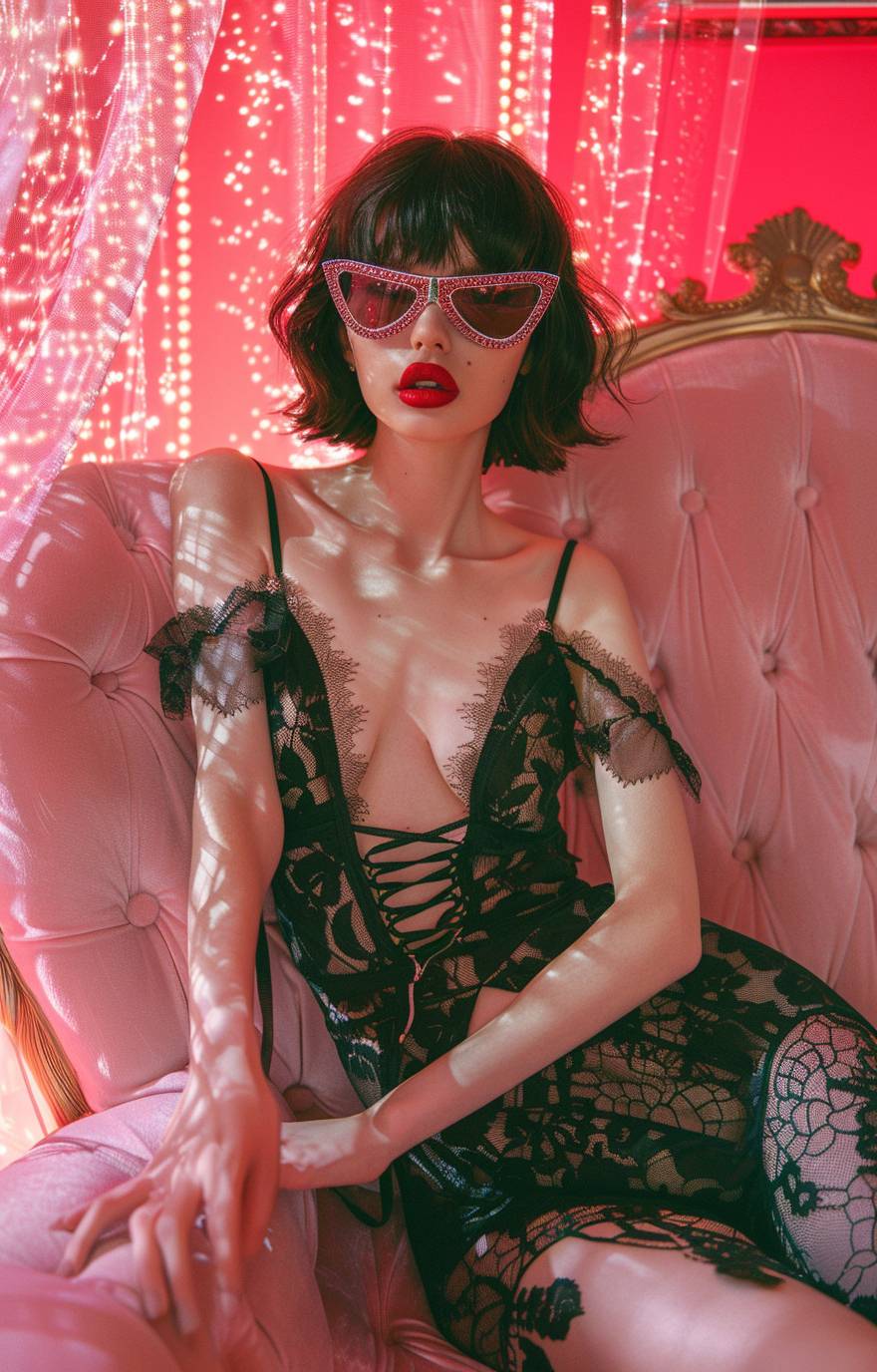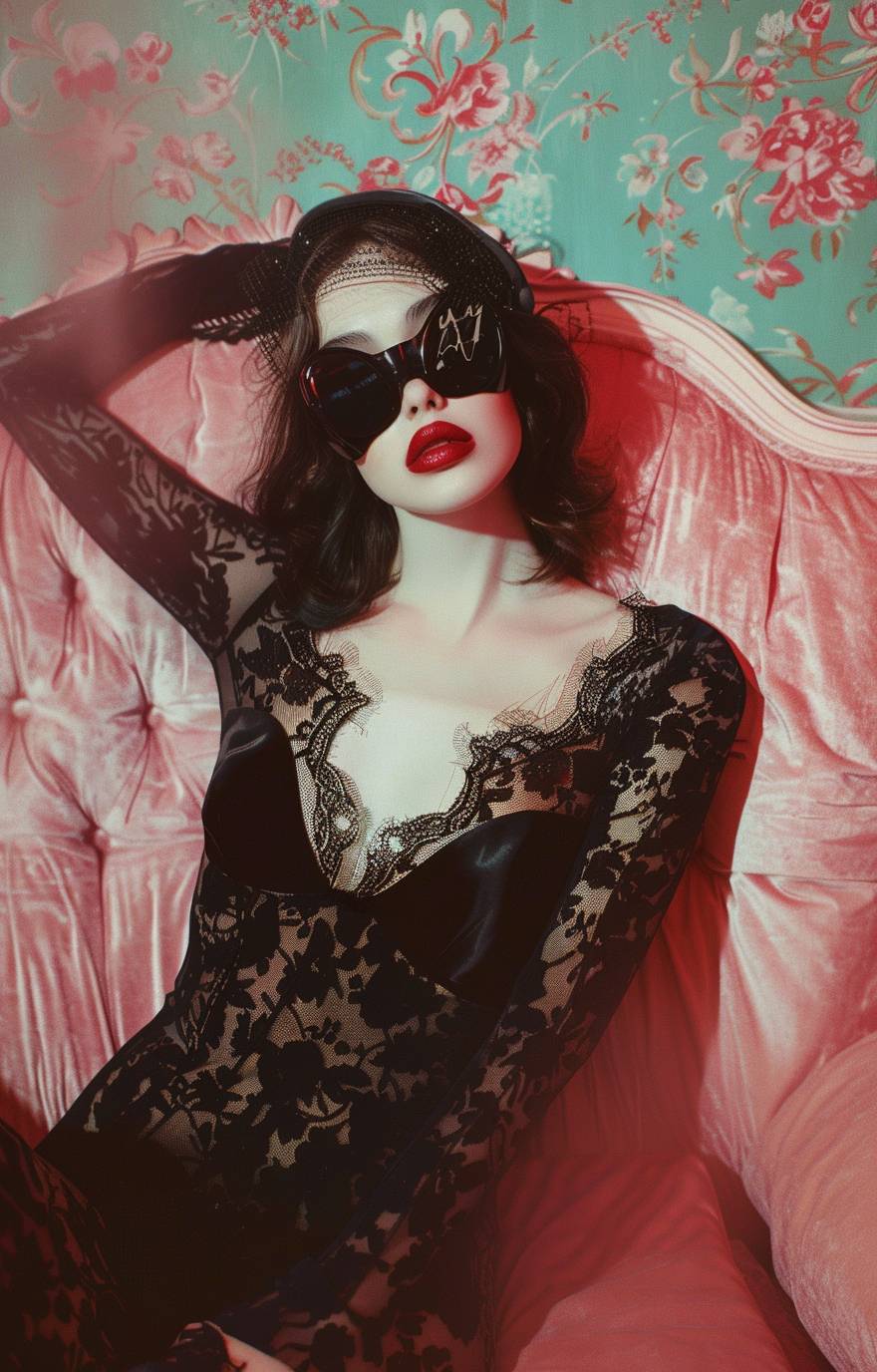 A woman in black lace and satin loungewear, wearing an eye mask and red lipstick is sitting on a pink sofa with a soft pastel background. The bold fashion photography has a surrealistic and hyper realistic style with high resolution and high details showing a full body portrait in a dynamic pose with studio lighting. The image has a retrofuturistic and cyberpunk style captured with a vintage camera lens in a wide angle shot with natural light creating a dreamy atmosphere and cinematic feel resembling a vogue editorial magazine cover. --ar 41:64 --v 6.0