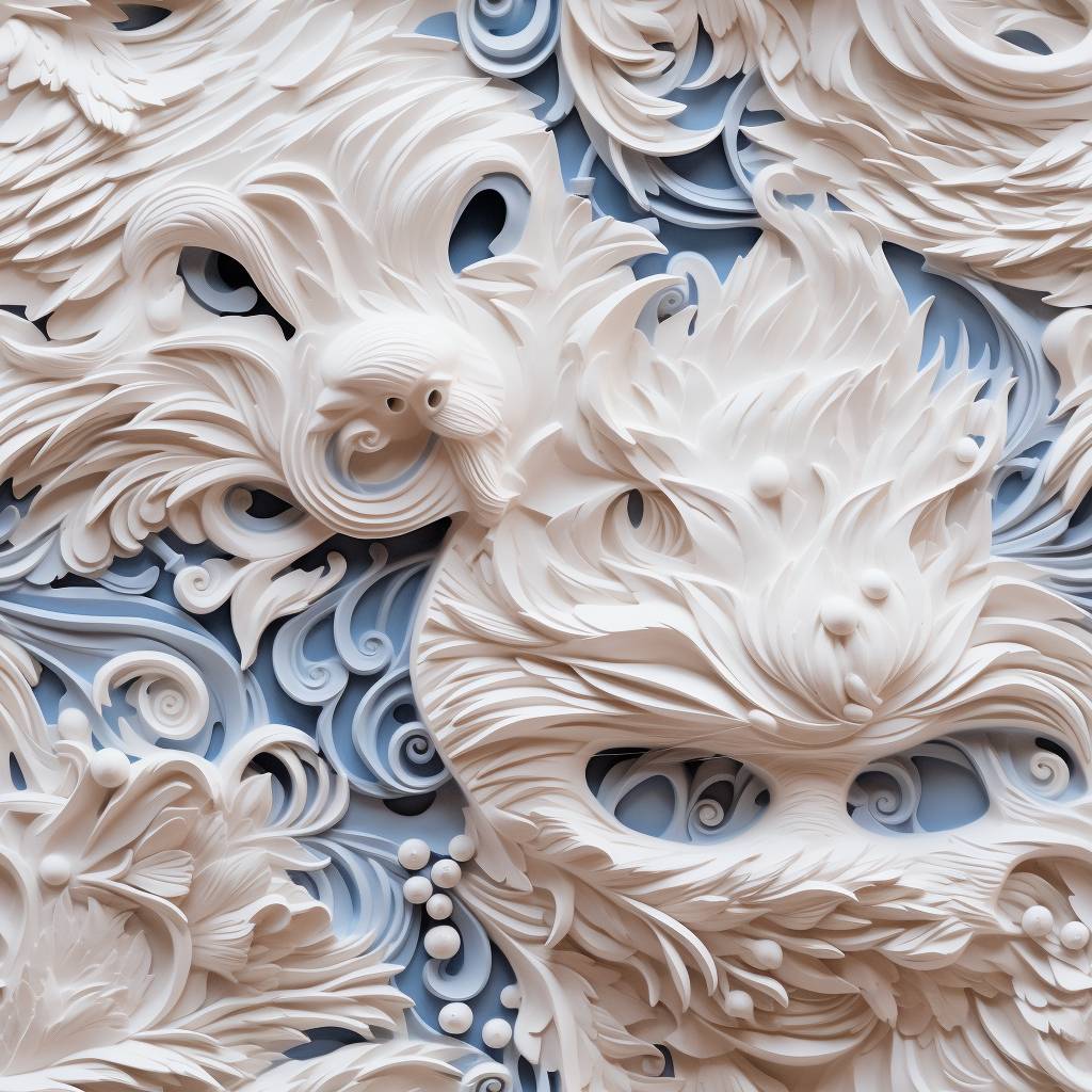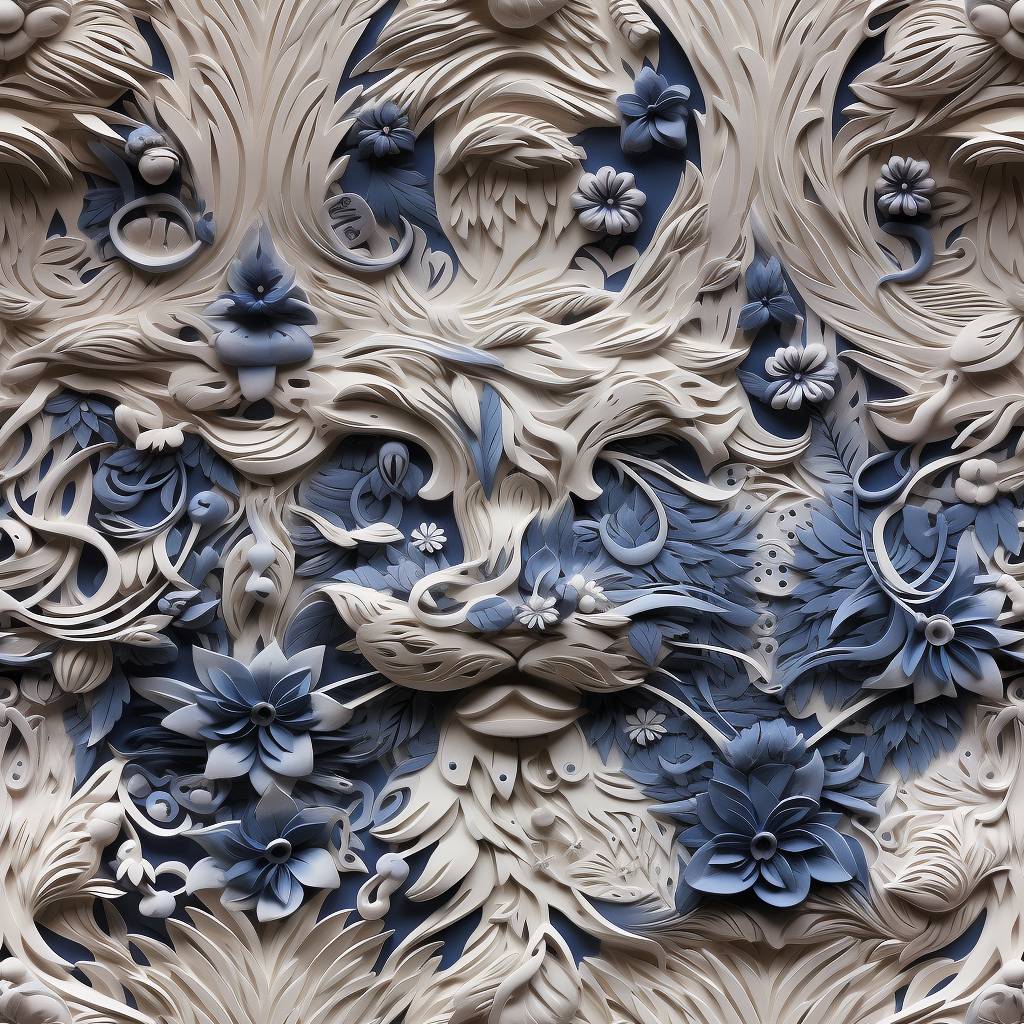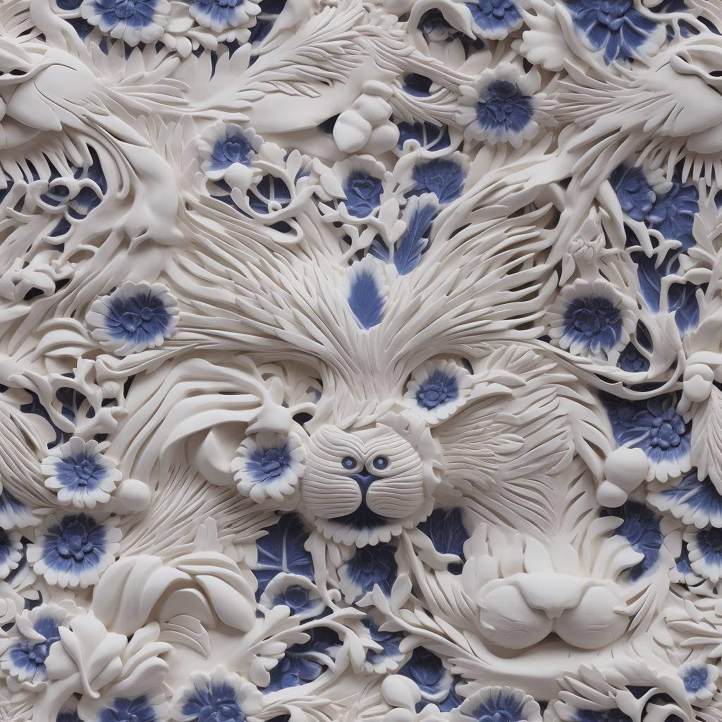 Сложный барельеф из фарфора в стиле ваби-саби, изображающий величественного кота.