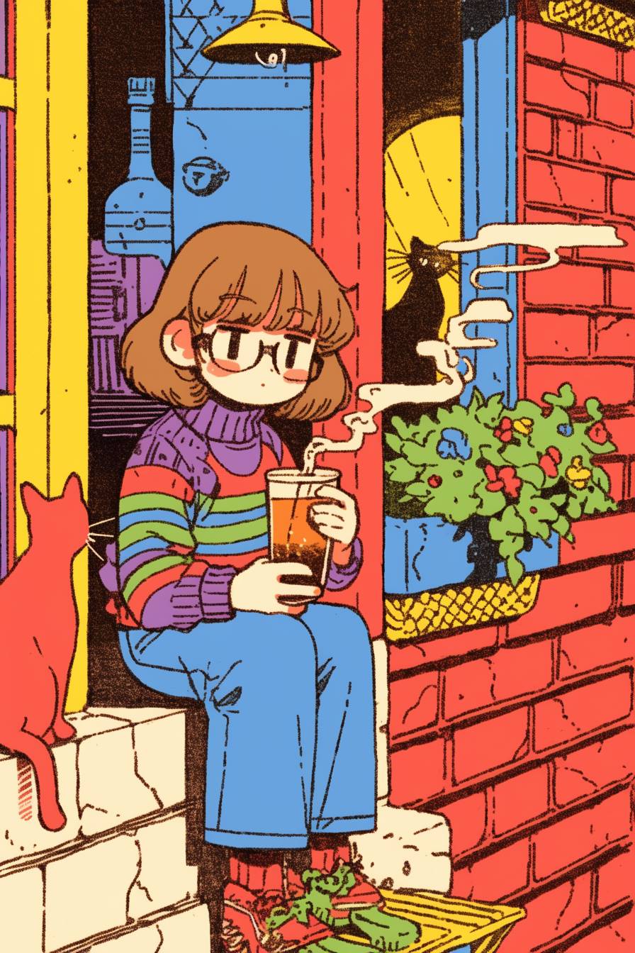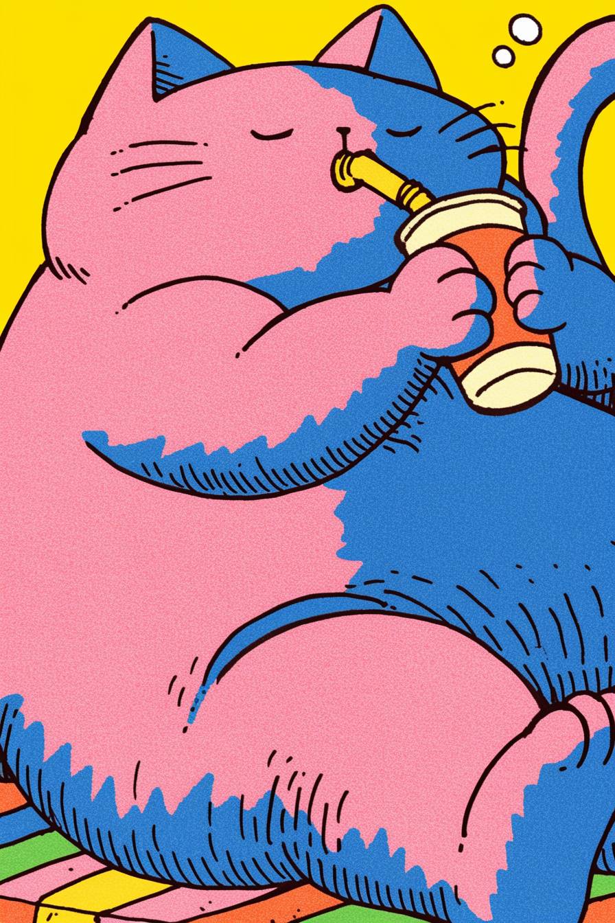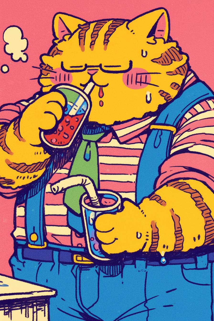 Fat cat drinks cola. --ar 2:3 --niji 6 --sref 419643348