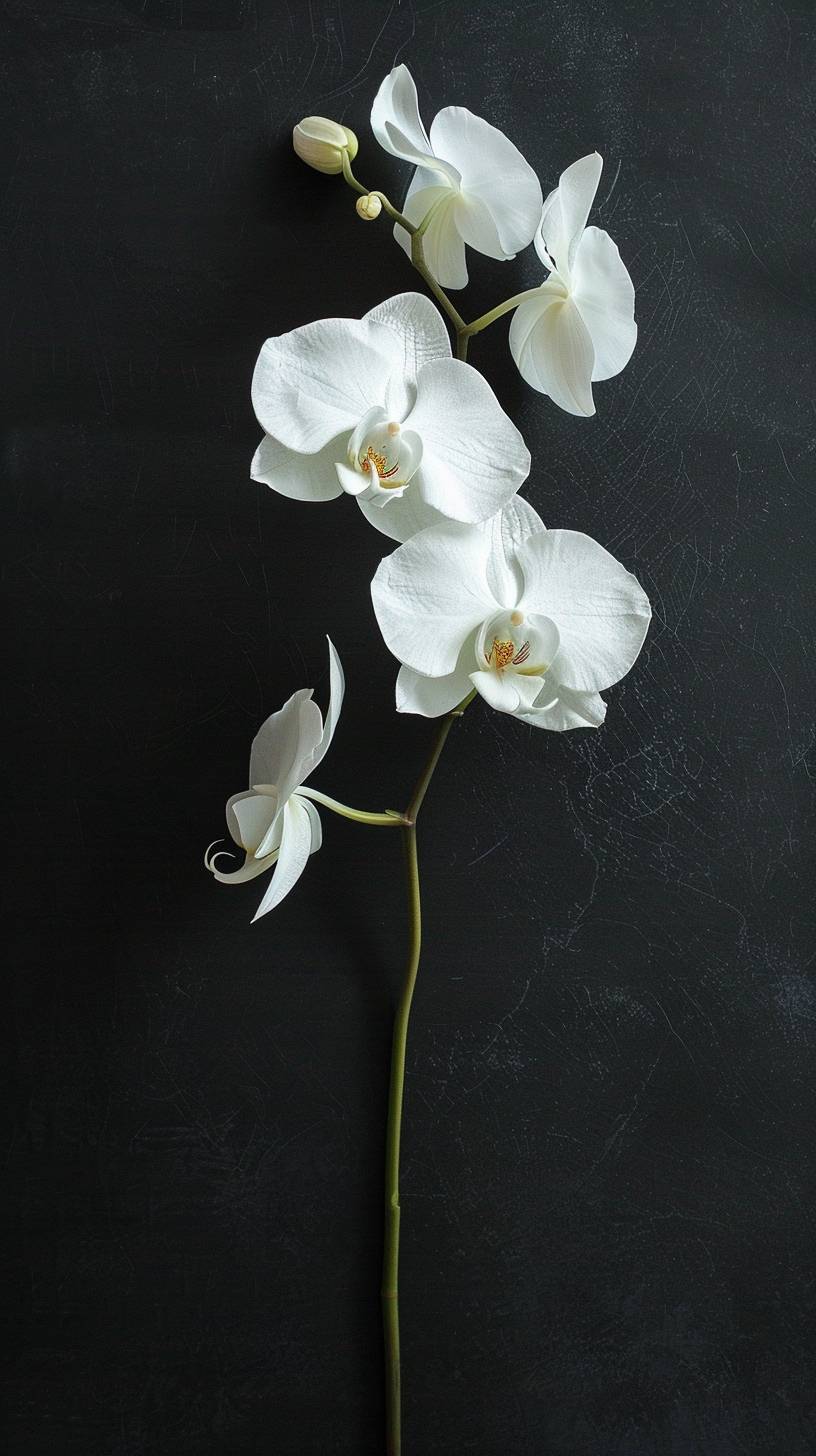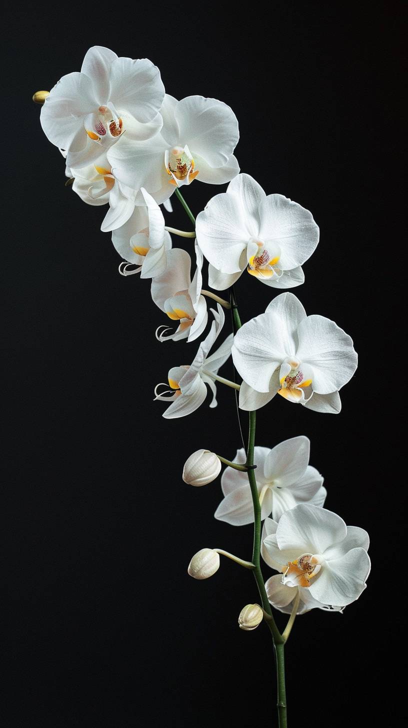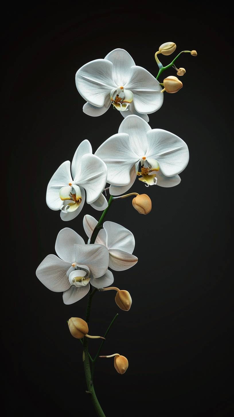 Гиперреалистичная, ультратонкая белая орхидея на черном фоне.