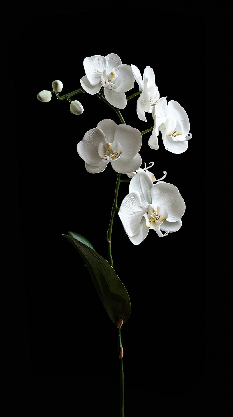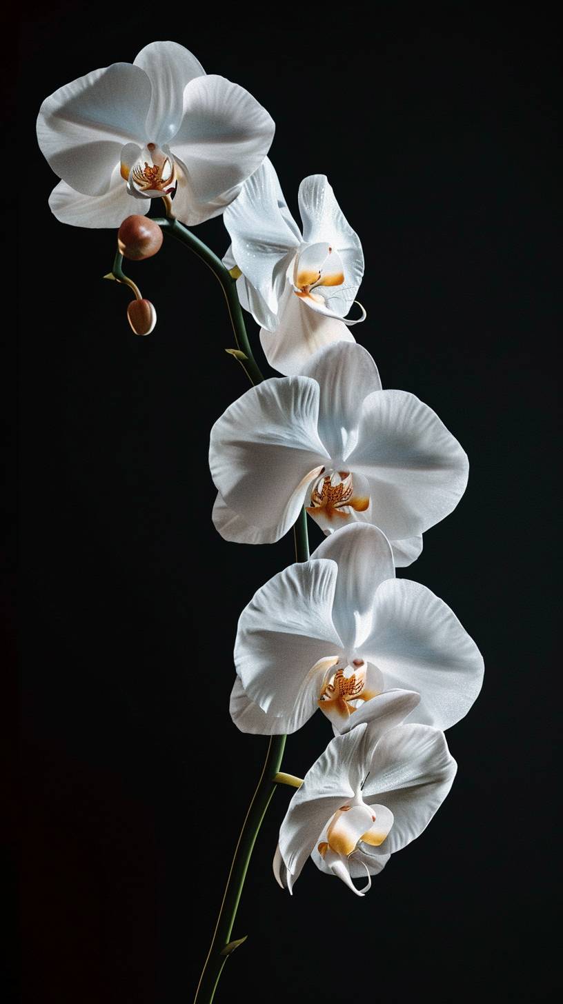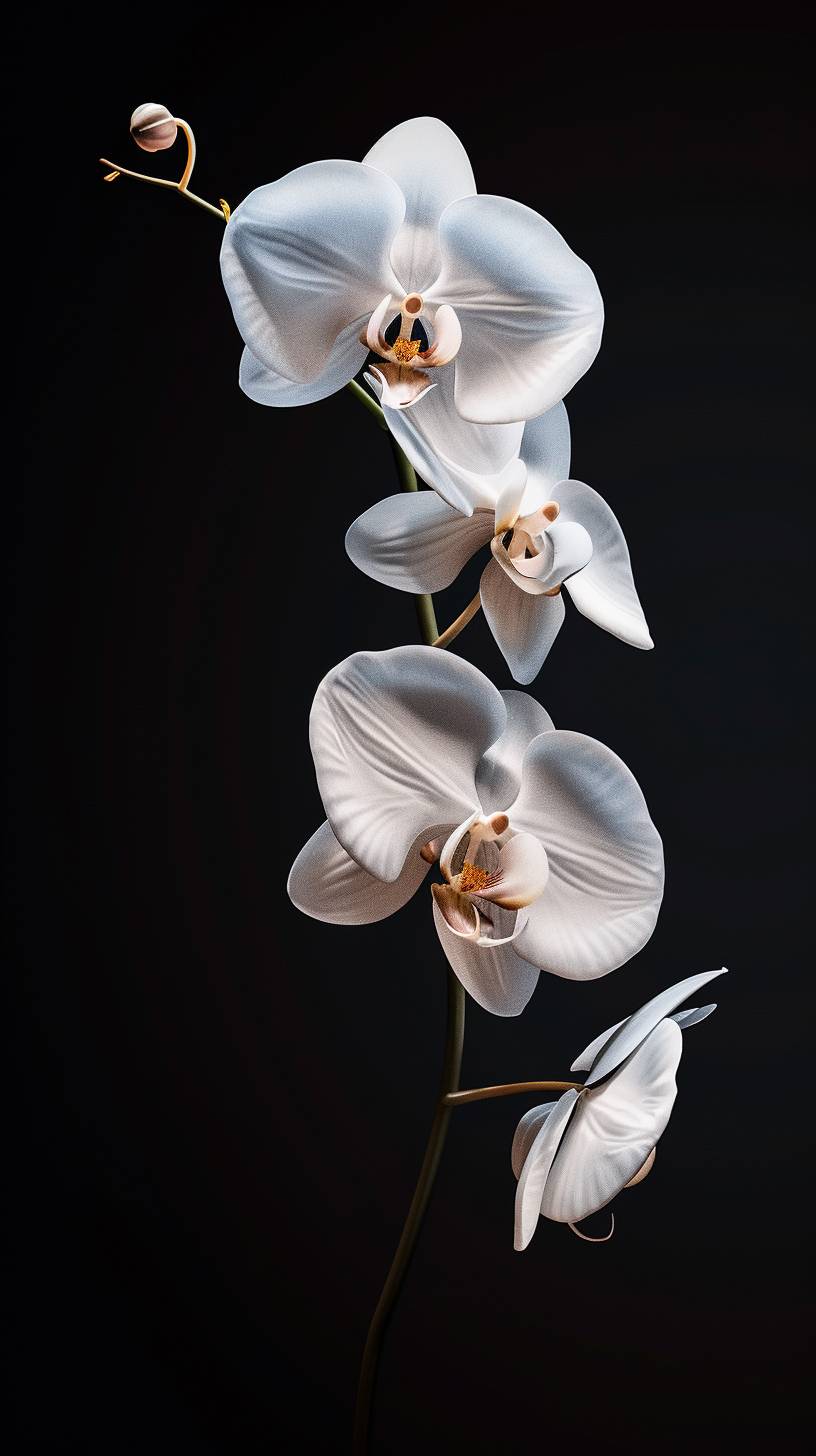Гиперреалистичная, ультрадетализированная белая одиночная орхидея на черном фоне.