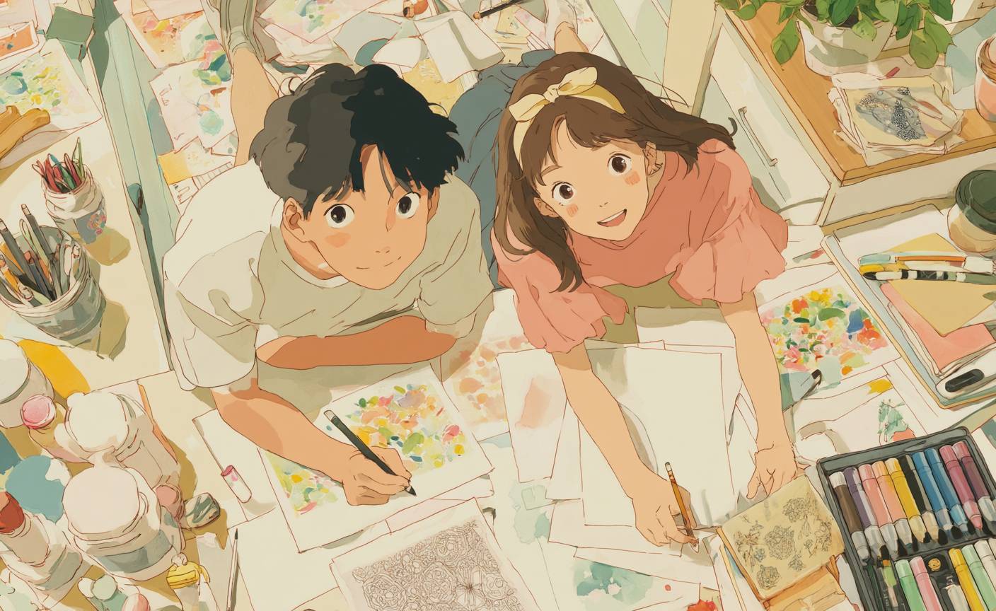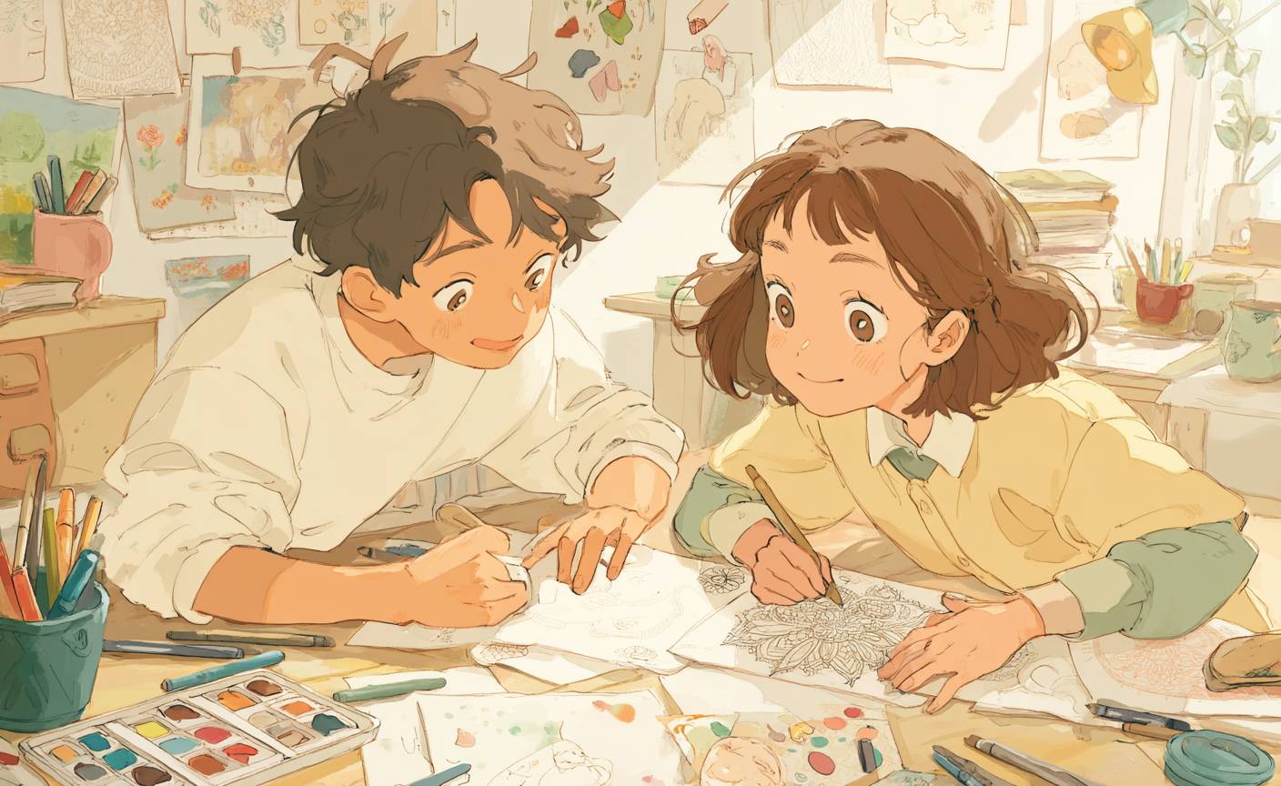 Два японских подростка 15-24 лет весело рисуют узоры зентангл в ярком классе, окруженные цветными художественными принадлежностями.