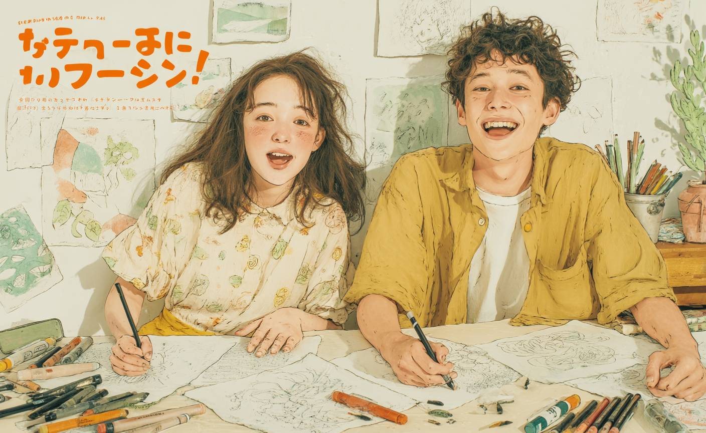 A vibrant event poster . Two 15-24 years old Japanese youths (one boy and one girl) cheerfully drawing in a light and airy classroom with pastel decorations, drawing intricate Zentangle patterns with black pens on white paper, surrounded by colorful art supplies like markers and sketchbooks. Style is modern, energetic, and full of creative charm. --ar 500:309 --profile 8hmwkvo --stylize 250 --v 7.0