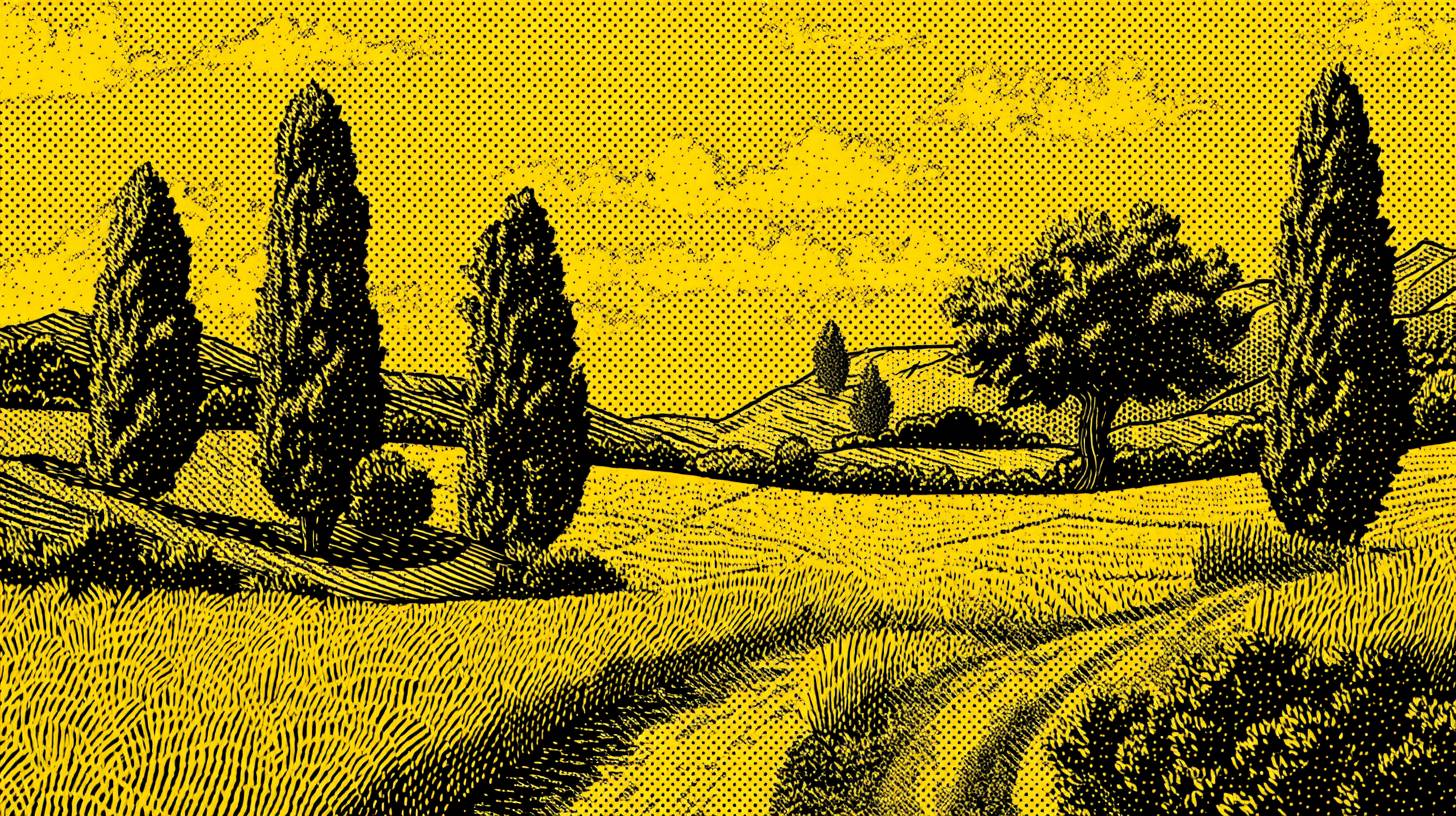 A wheat field yellow and black image is rendered in a flat halftone vector style using large dots with high contrast; only 2 colors white (background) and black (artwork) --ar 16:9 --profile giffjpq --stylize 250 --v 7.0