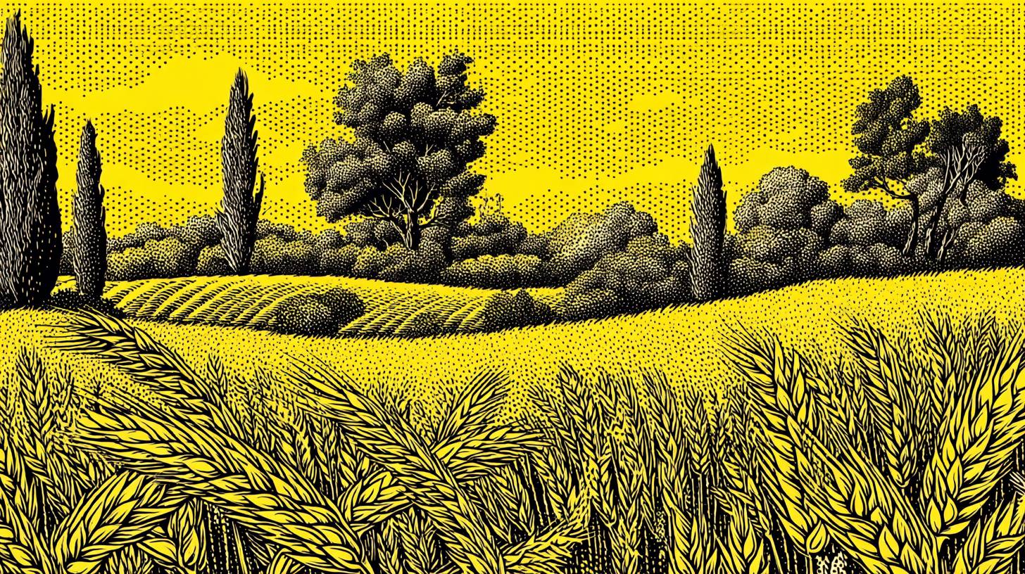 Изображение пшеничного поля в желто-черном цвете, выполненное в стиле плоского полутонового вектора с крупными точками и высоким контрастом.
