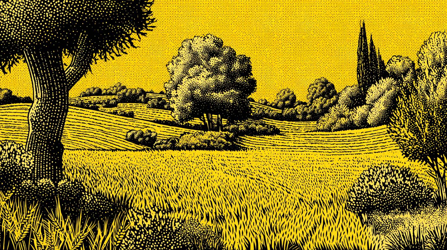Изображение желтого и черного пшеничного поля выполнено в плоском векторном стиле с использованием крупных точек с высоким контрастом; только 2 цвета: белый (фон) и черный (арт).