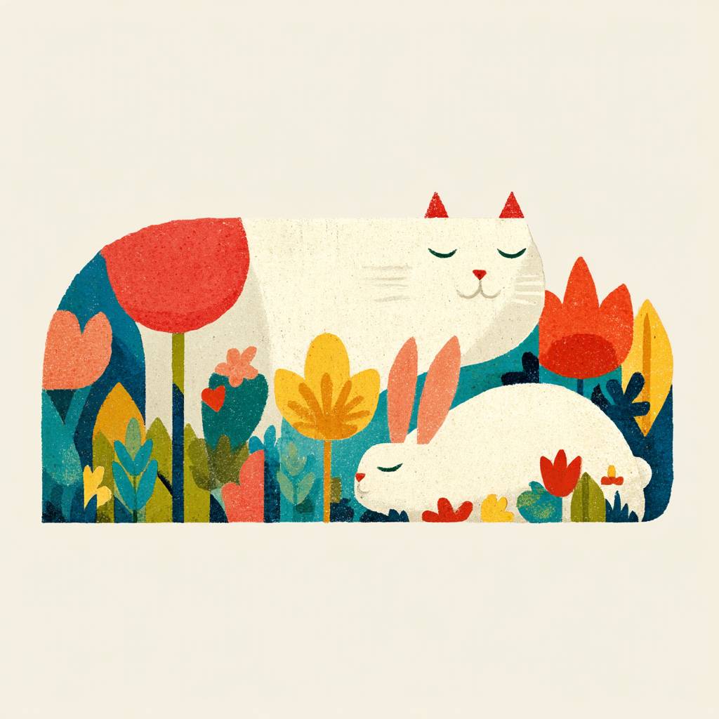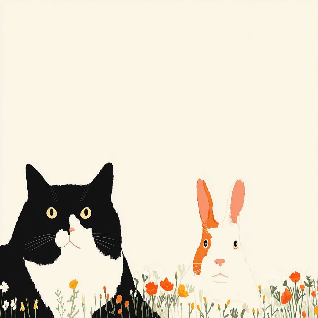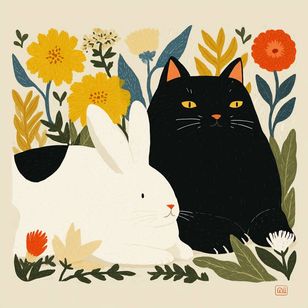 Пухлая кошка и друг-кролик лежат в окружении диких цветов