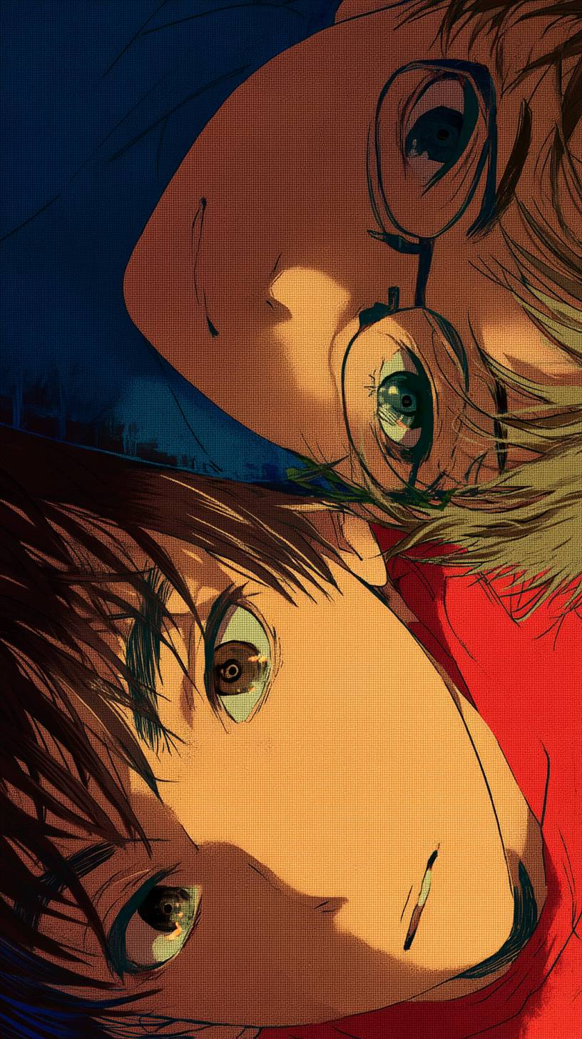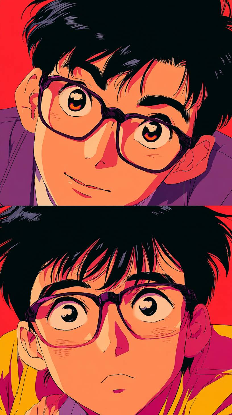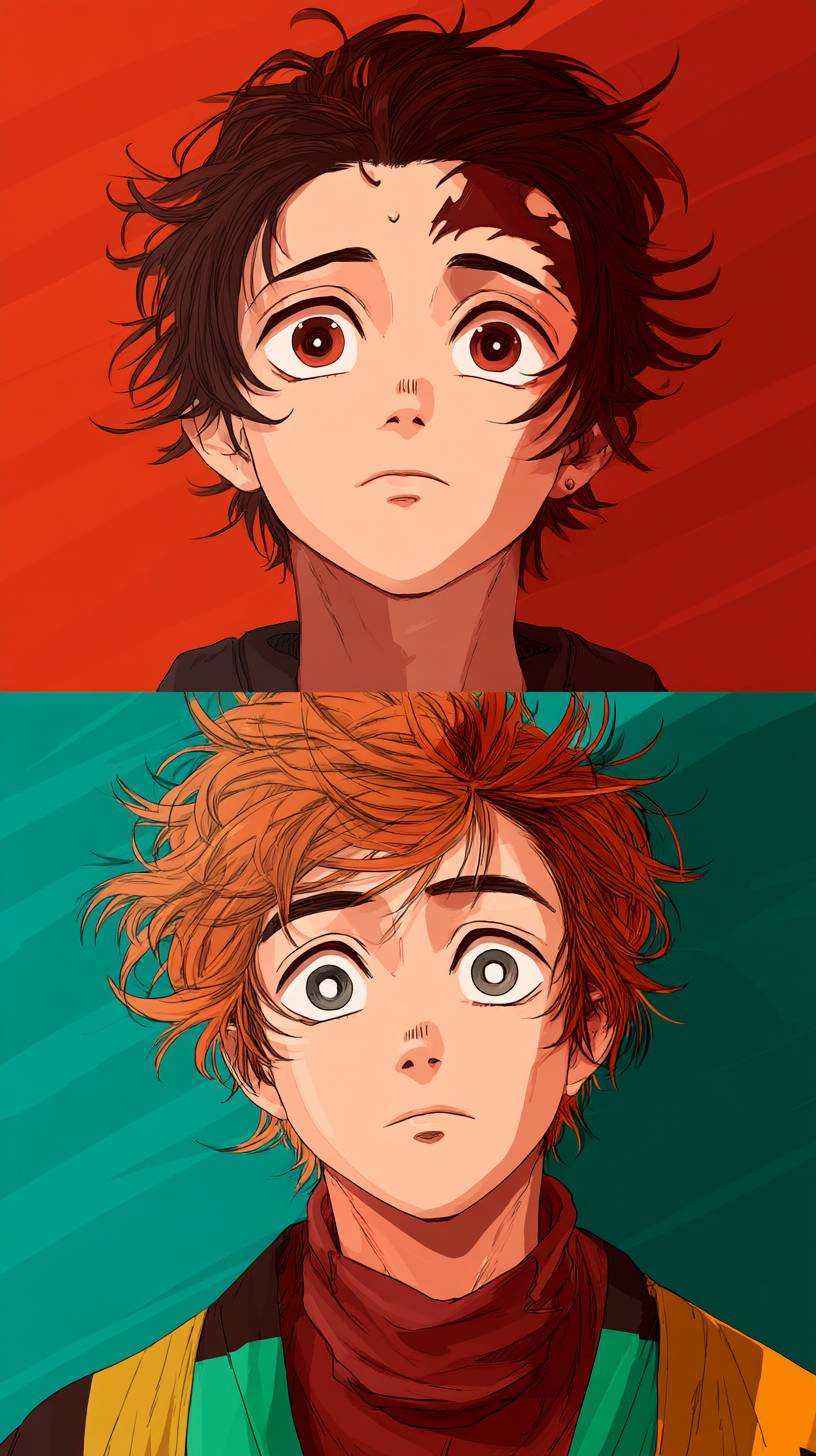 um desenho animado estilo japonês de 2 jovens homens, se okha do nos olhos, apaixonados e com muita admiração e paixao, muito colorido --ar 9:16 --v 7.0