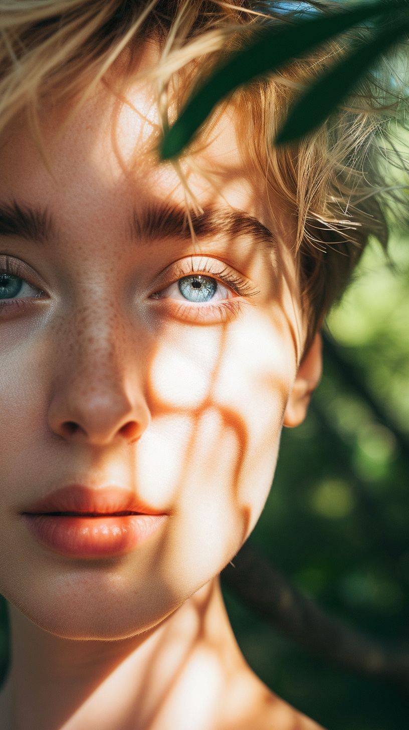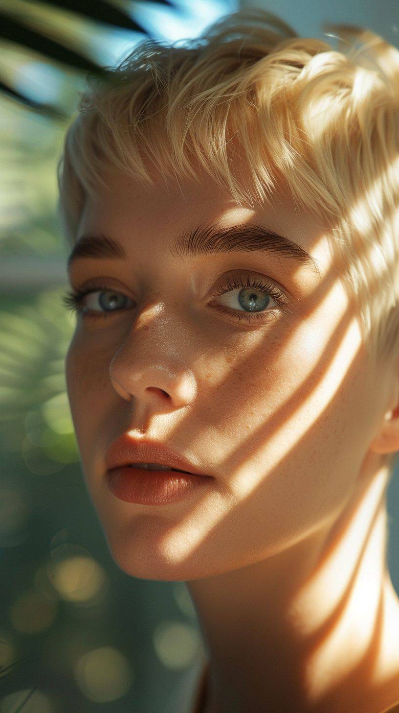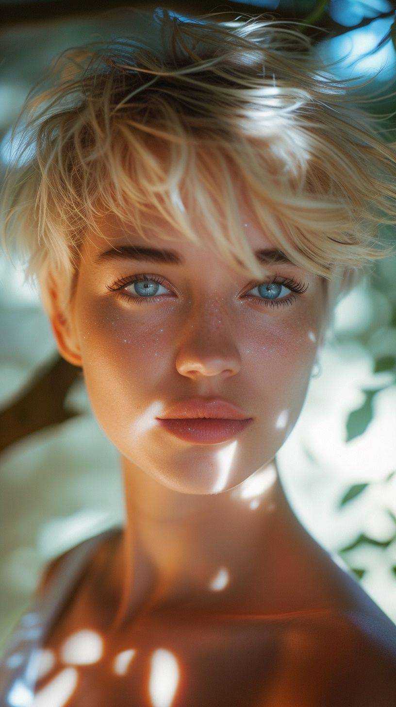 Extreme close-up shot portrait of a short blonde-haired woman, with rays of sunlight shining through the trees outside her window. Eliminate reflections and enhance the texture and color in her blue eyes for a raw, striking effect --ar 9:16 --v 6