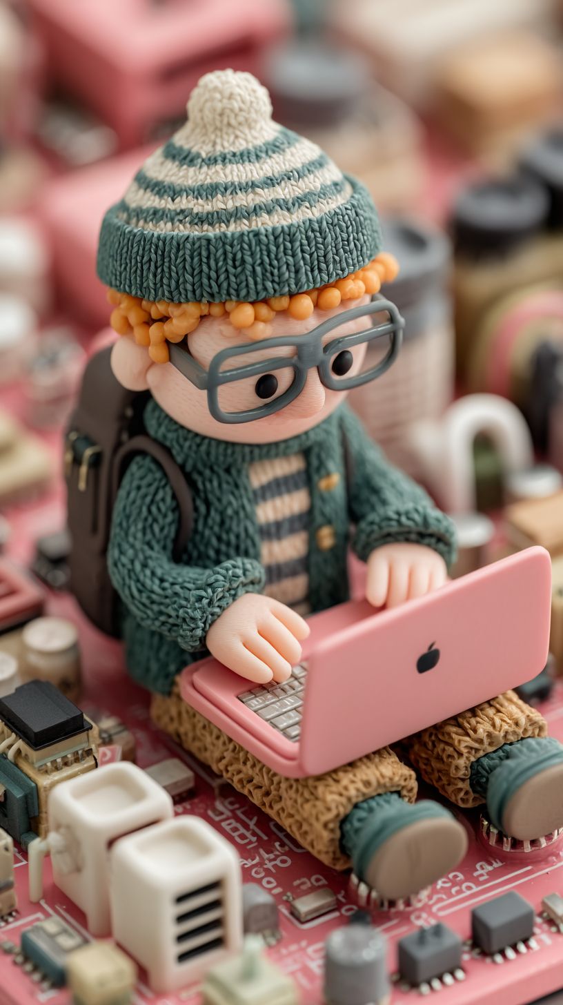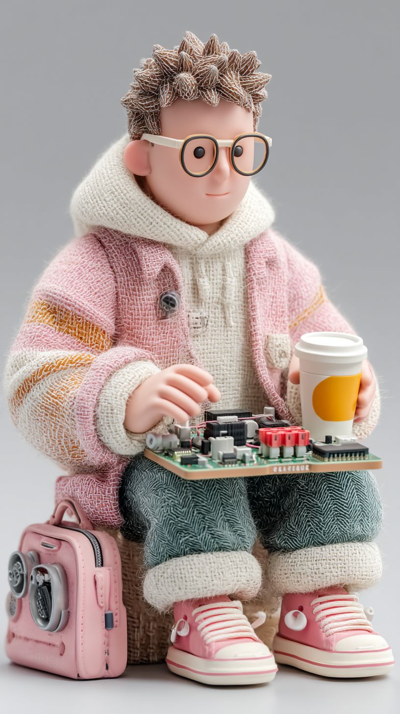 A cute but masculine 3d claymotion illustration of a colorful young adult male software engineer coding a Raspberry Pi electronic board on his laptop --ar 9:16 --stylize 1000 --v 7.0