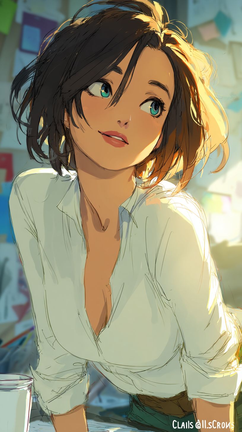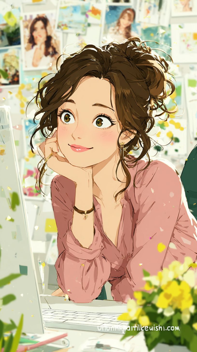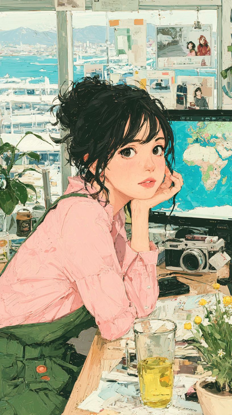 Иллюстрация в аниме-стиле, зрелая аниме-эстетика, шедевр, лучшее качество, высокодетализированная, красивая взрослая женщина с легкой улыбкой в профиль, в аккуратной светло-розовой рубашке, сидит за своим столом у окна, на мгновение прерывает работу, задумчиво глядя на улицу, яркая офисная обстановка, расслабляющая и приятная атмосфера, освежающая, приподнимающее настроение, мягкие цвета, бледная цветовая палитра, низкий контраст, весенне-летний сезон, 'Мгновение паузы'