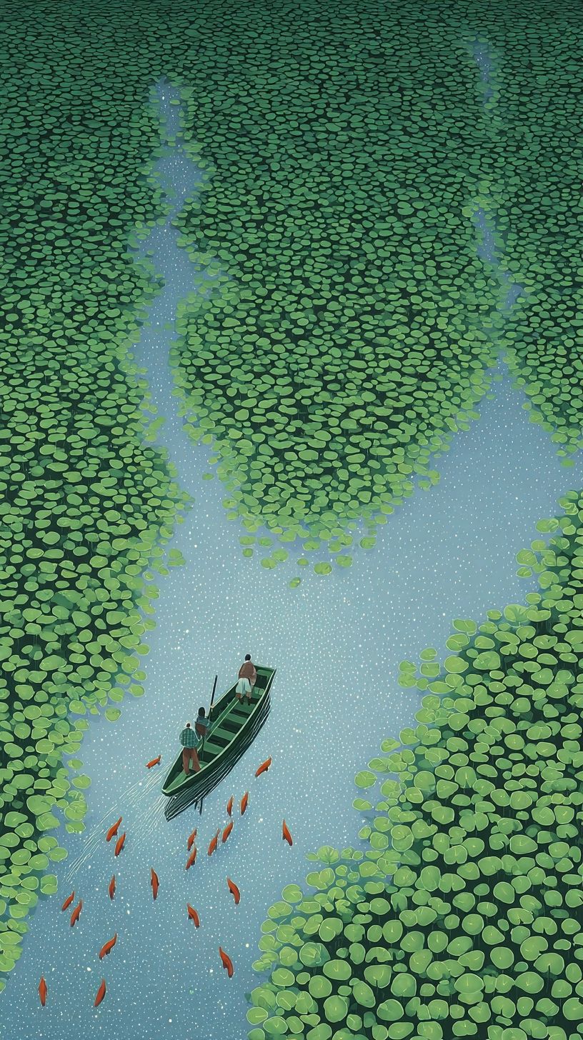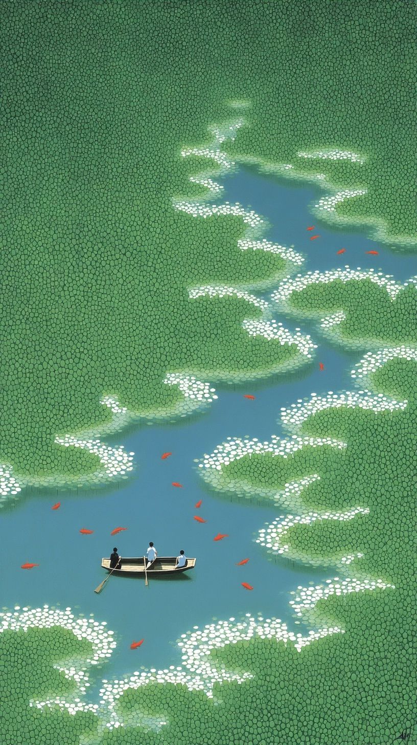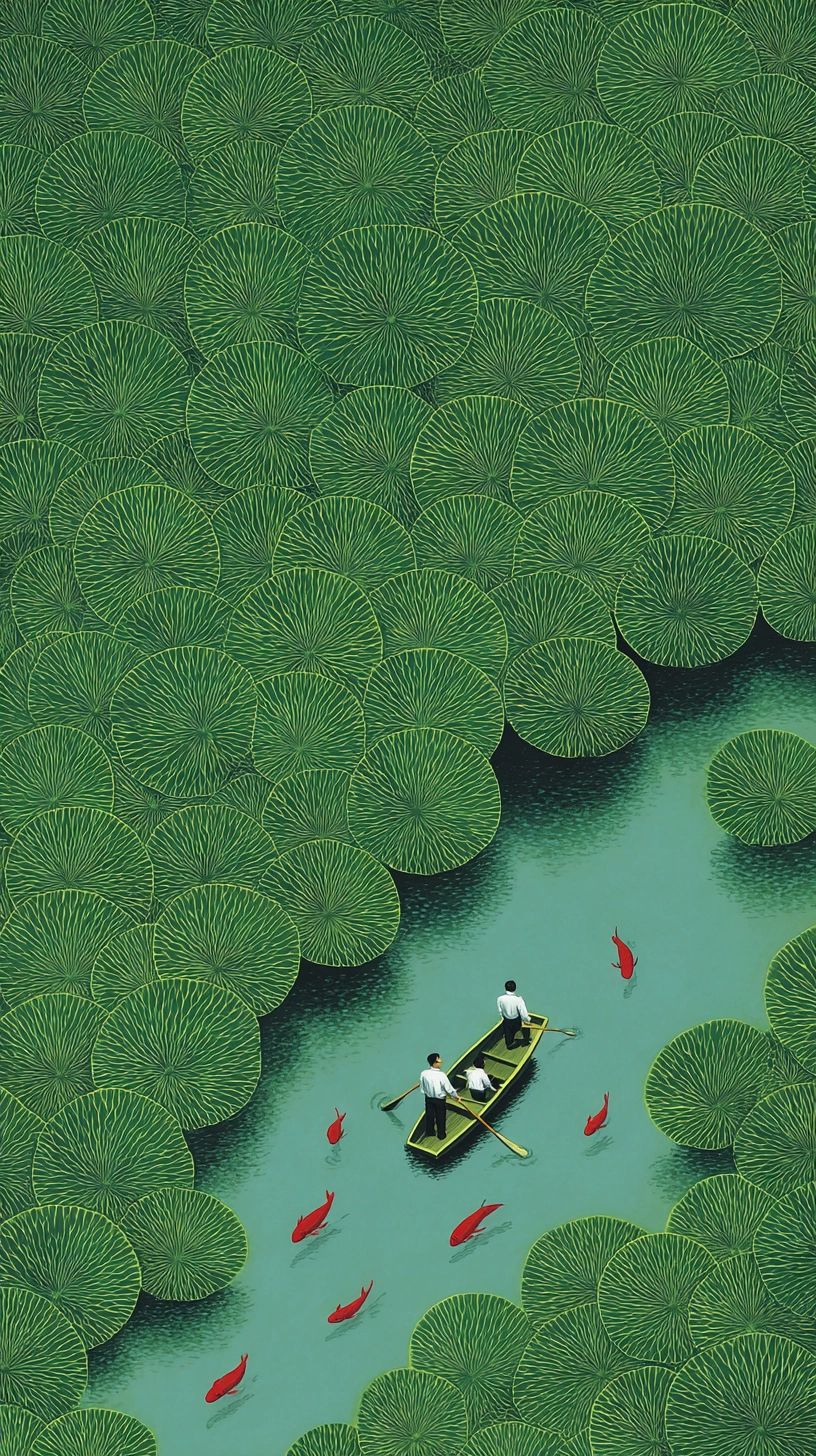 A painting depicting an overhead view of a pond covered with lush green lotus leaves. The lotus leaves are stacked layer upon layer, and through the gaps between them, red carp can be seen swimming in the water. The scene is well-lit by the sun, and the lotus leaves create reflections on the water's surface, adding depth to the picture. There are two people in a small boat, rowing with wooden oars in the water. This artwork, in the style of John Singer Sargent, conveys a sense of tranquility and harmony between nature and human presence. --ar 9:16 --exp 50 --profile rou6ods --stylize 50 --v 7.0