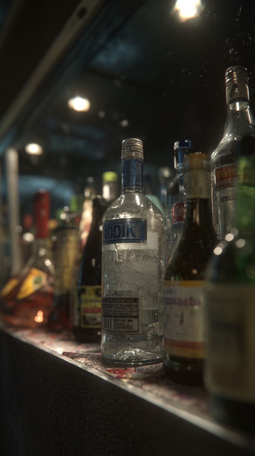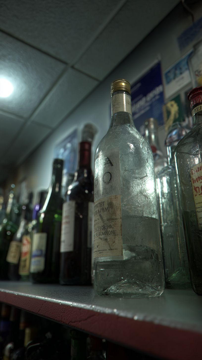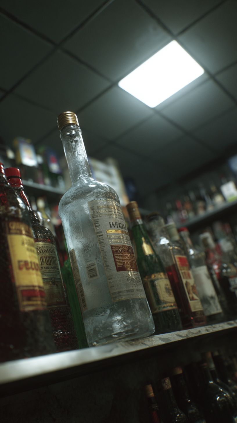 Photorealistic close-up of a clear vodka bottle on a dimly lit shelf inside a Parisian corner store, surrounded by other liquor bottles--some tall, some stubby, with mismatched labels. The vodka bottle is slightly tilted, its label worn, and faint condensation clings to the glass. Soft reflections of the store’s ceiling lights shimmer on the glass. Behind it, blurred outlines of whiskey, pastis, and cheap wine create a dense, urban arrangement. Dust lines the edge of the shelf. Quiet tension, grounded realism --ar 9:16 --profile 8sio59s --v 7.0