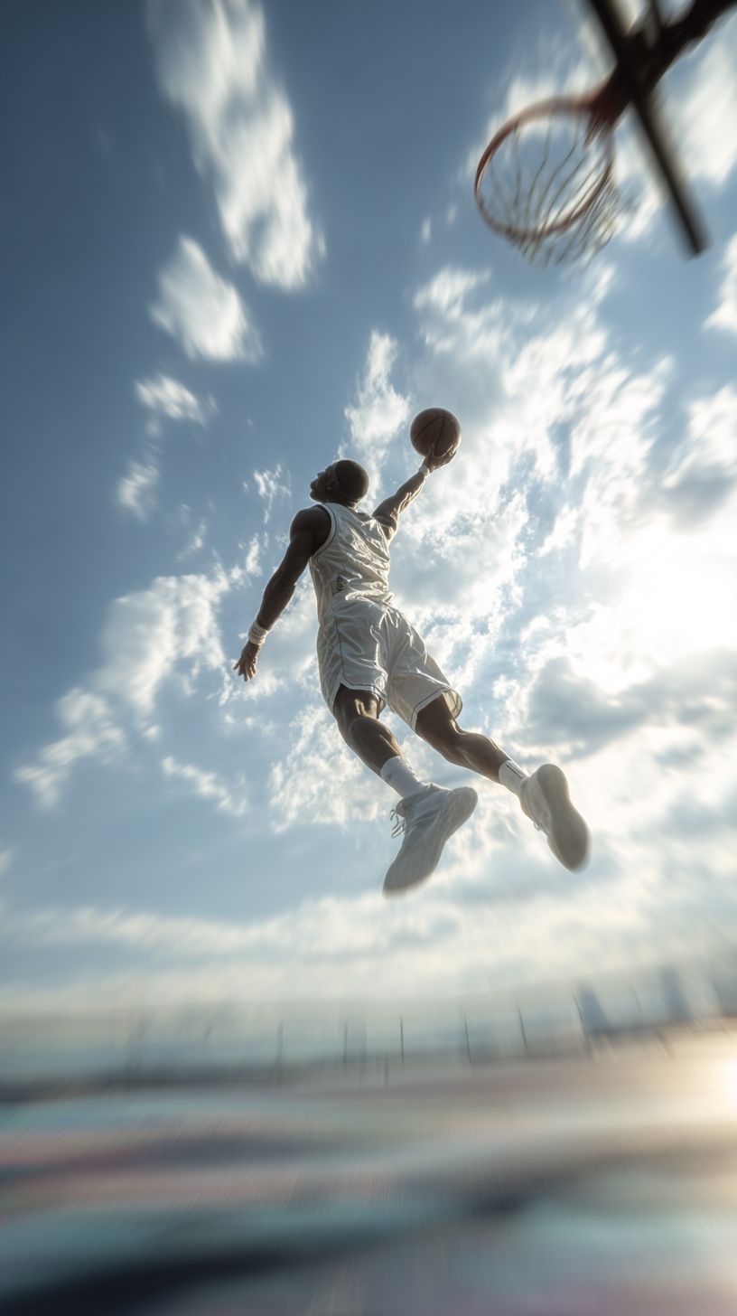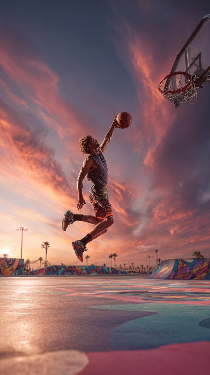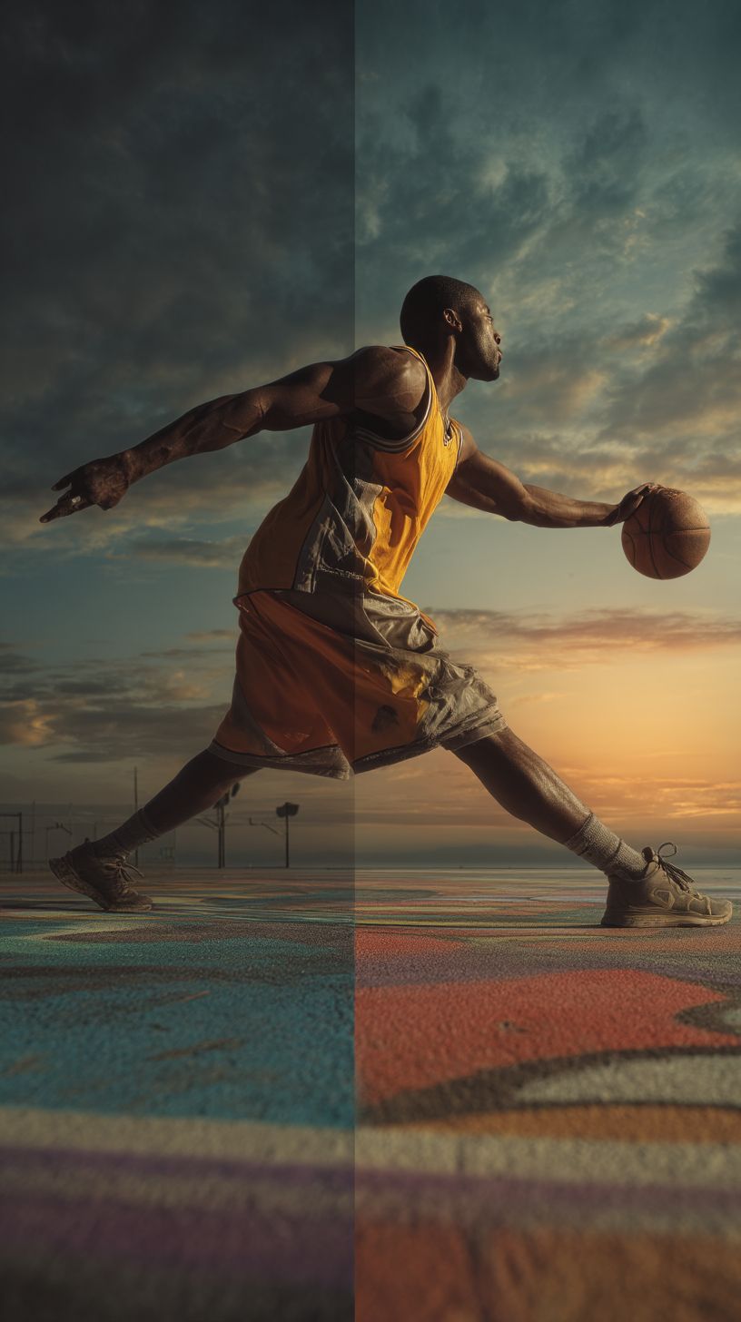Бесшовная вертикальная переходная композитная сцена: данк в баскетболе, переходящий в спринт, переходящий в позу воина в йоге, все спортсмены в моделях Pulse, окружающая среда сочетает линии корта, уличное искусство и облака на закате, снято на Sony Venice 2 с парфокальным зумом 50-1000 мм.
