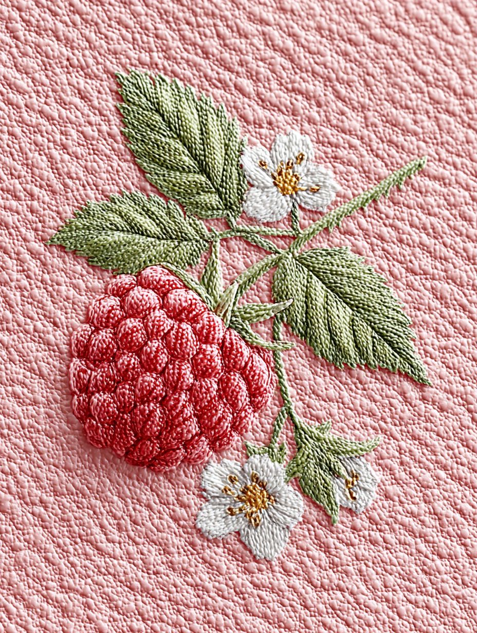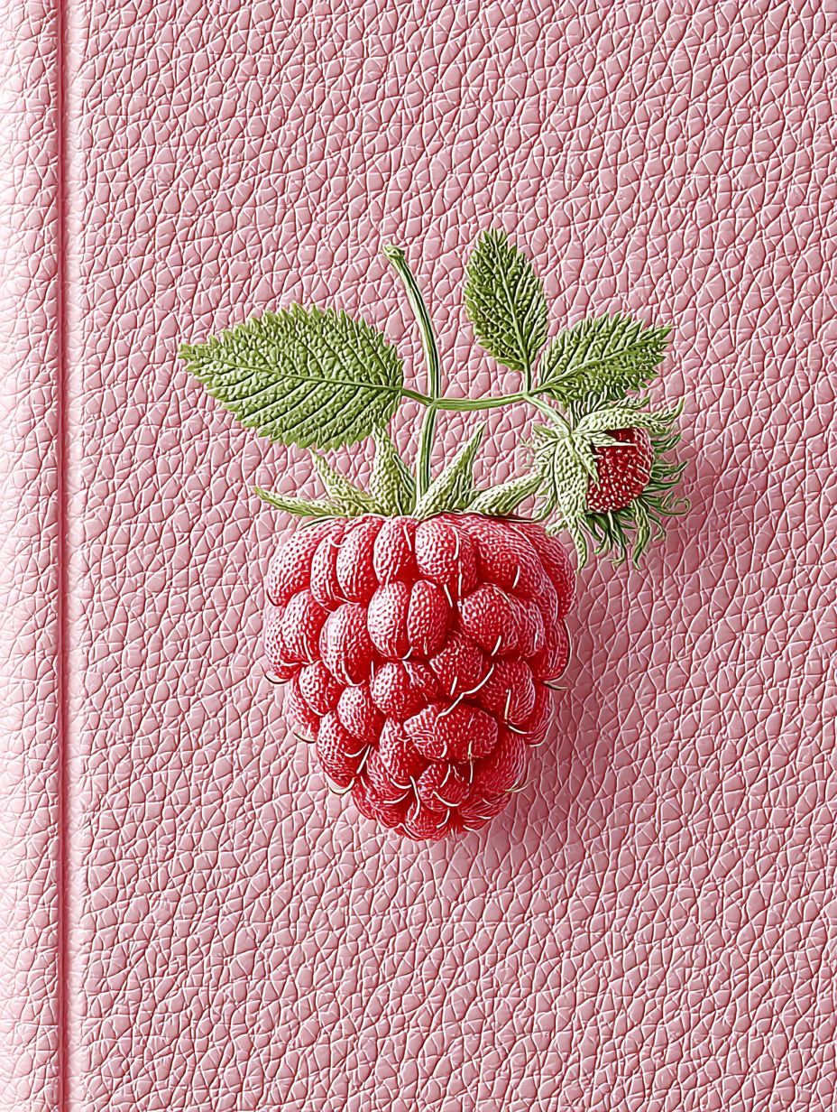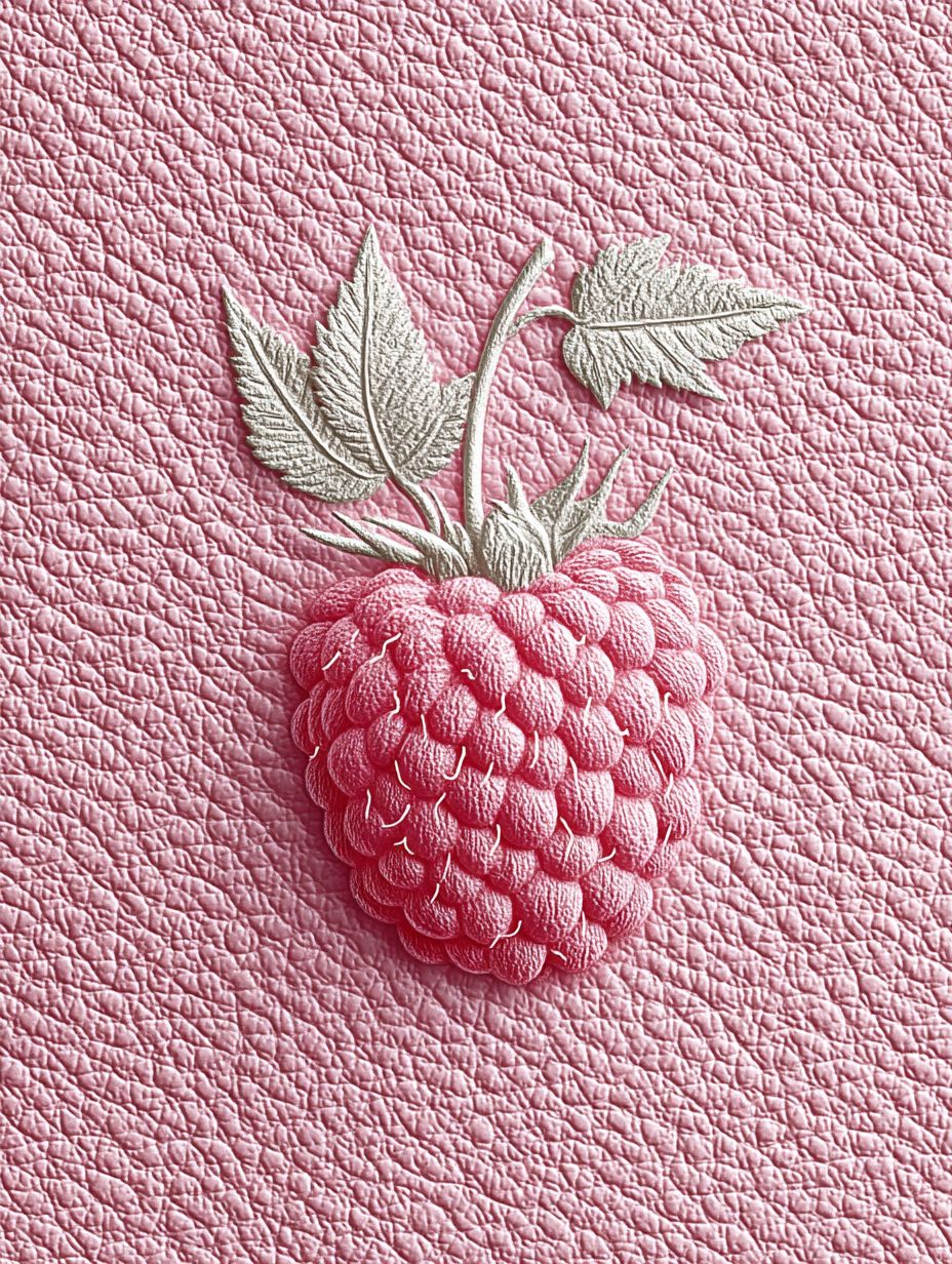 a pink piece of textured leather with a stylized flat drawing of a rasberry pressed into it. ultra realistic, editorial quality --chaos 20 --ar 3:4 --profile p9cqeju --stylize 550 --v 7.0 --raw