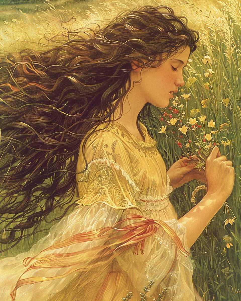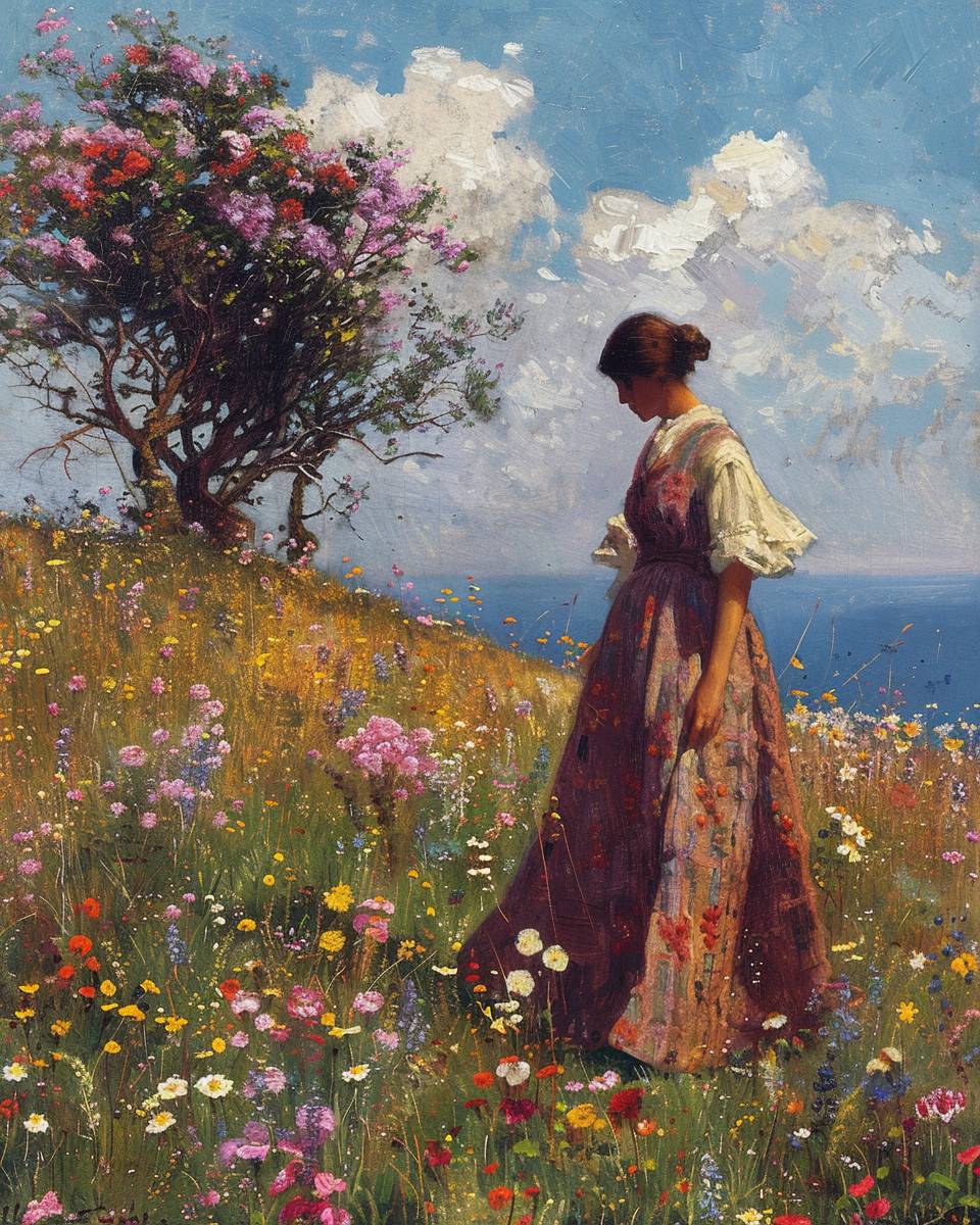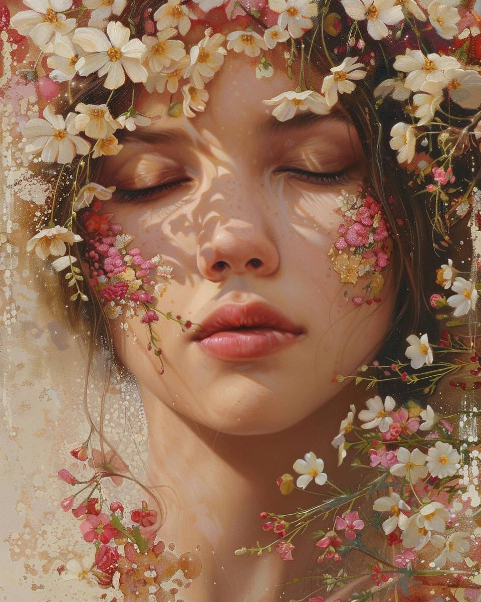 contemporary interpretation in art of the poem: Shall I compare thee to a summer’s day? Thou art more lovely and more temperate: Rough winds do shake the darling buds of May, And summer’s lease hath all too short a date; Sometime too hot the eye of heaven shines, And often is his gold complexion dimm'd; And every fair from fair sometime declines, By chance or nature’s changing course untrimm'd; But thy eternal summer shall not fade, Nor lose possession of that fair thou ow’st; Nor shall death brag thou wander’st in his shade, When in eternal lines to time thou grow’st: So long as men can breathe or eyes can see, So long lives this, and this gives life to thee. --ar 4:5 --v 6.0