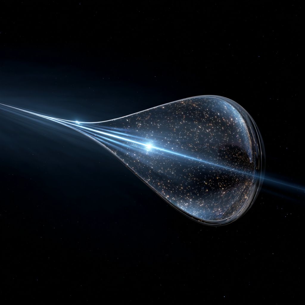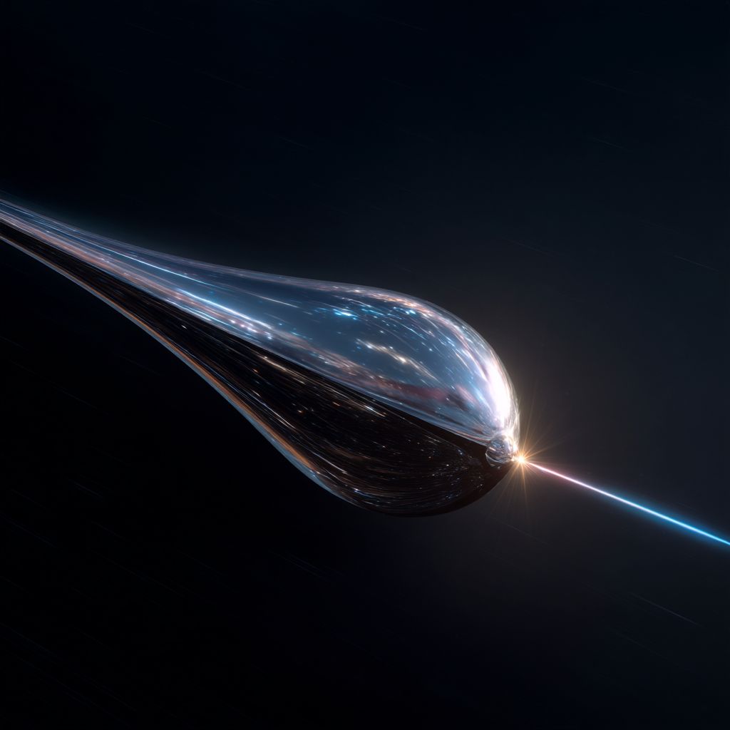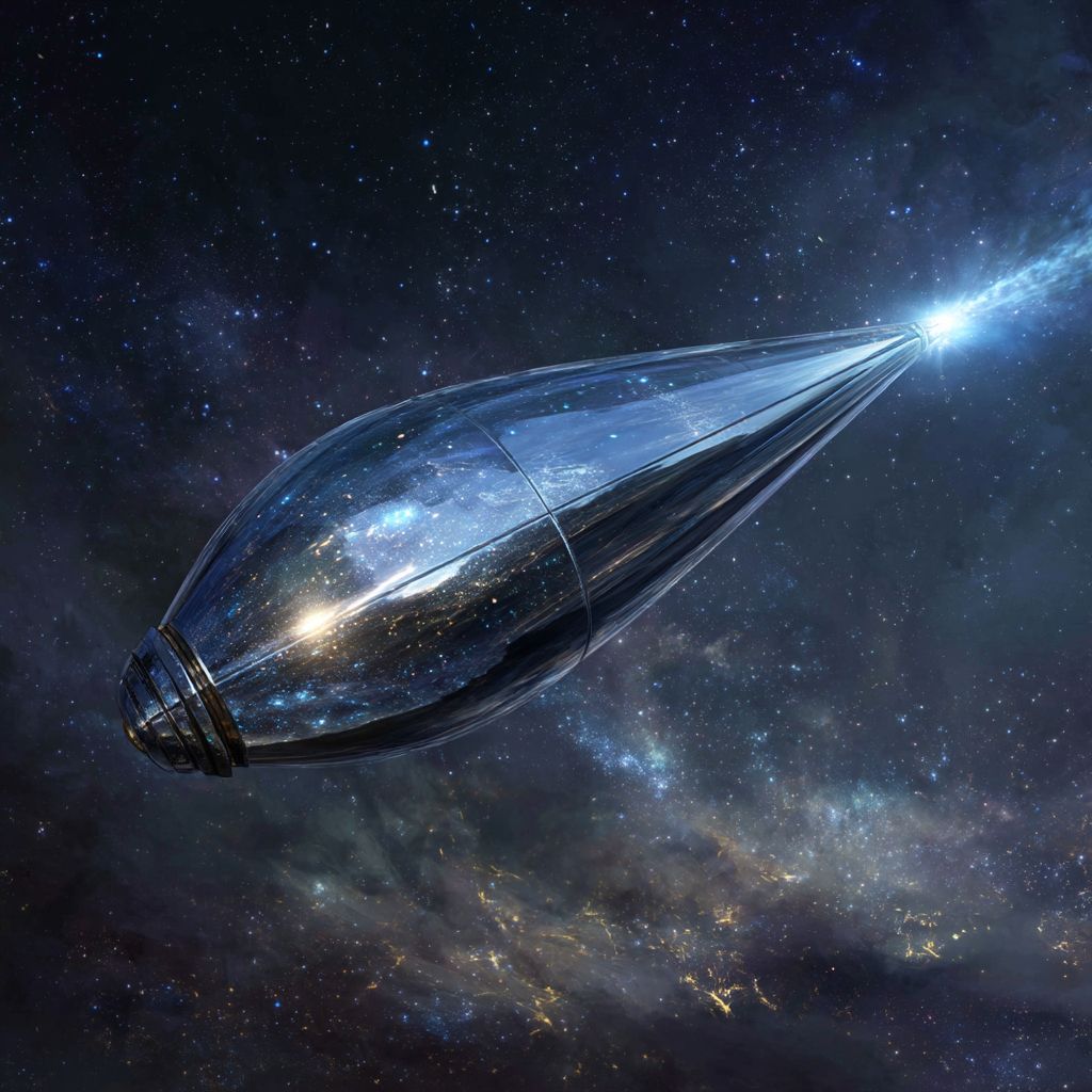 The teardrop-shaped detector in space has a mirrored surface, smooth and without any objects, reflecting the entire universe. The invisible engine at the end emits a blue streak of light. --v 7.0