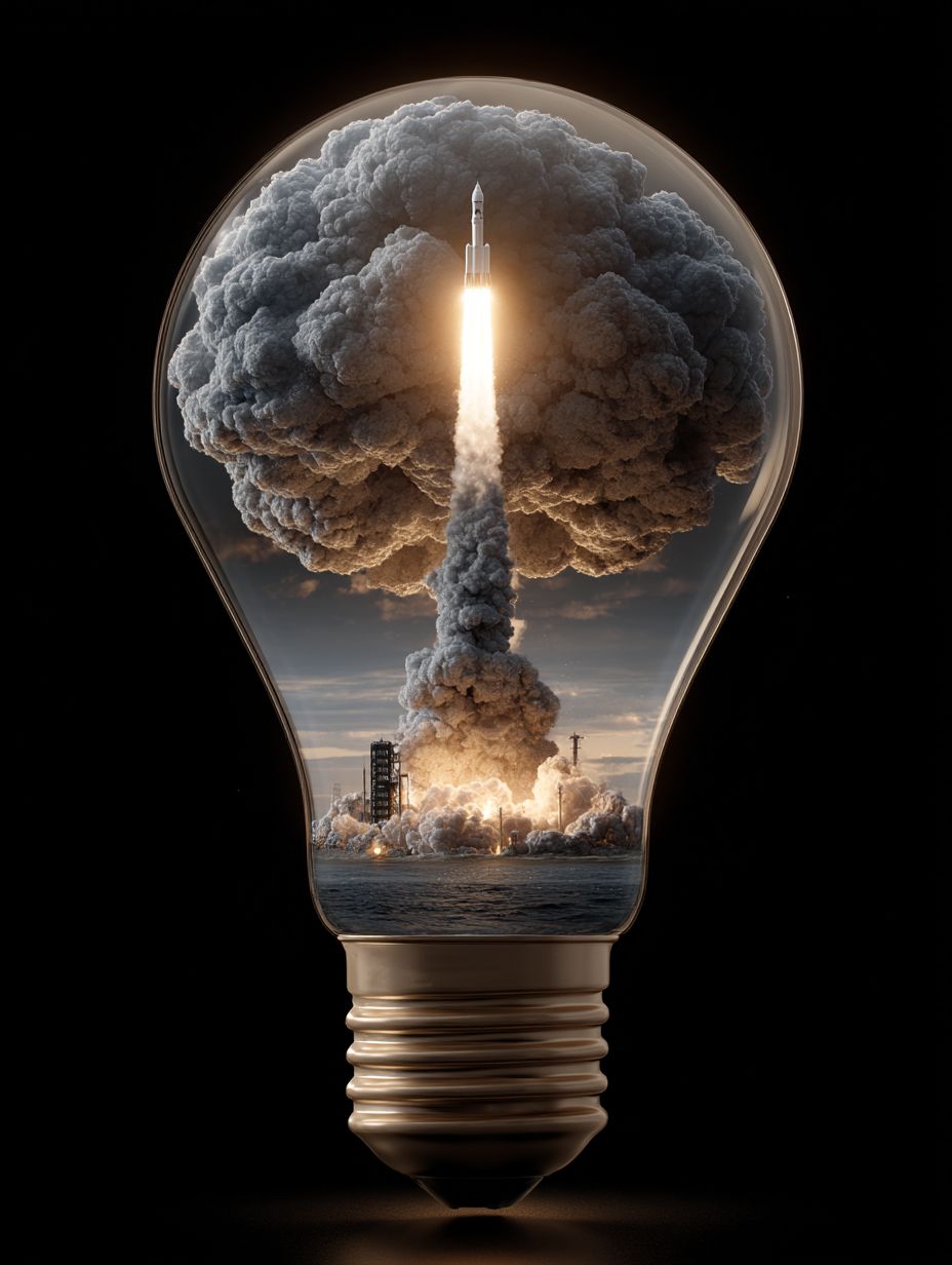 a mushroom cloud inside a light bulb with a rocket launch in the background --ar 3:4 --v 7.0