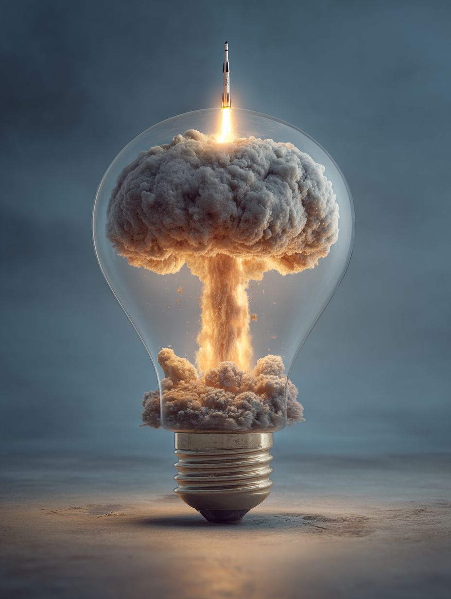 Грибовидное облако внутри лампочки на фоне запуска ракеты.