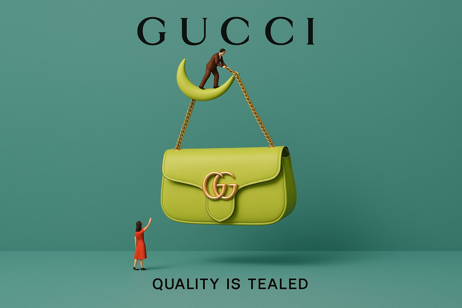 为GUCCI创意3D广告,具有超现实的物体,背景颜色相匹配,下面有真实的标语,顶部有标志,微型人物互动,简约而聪明的概念。