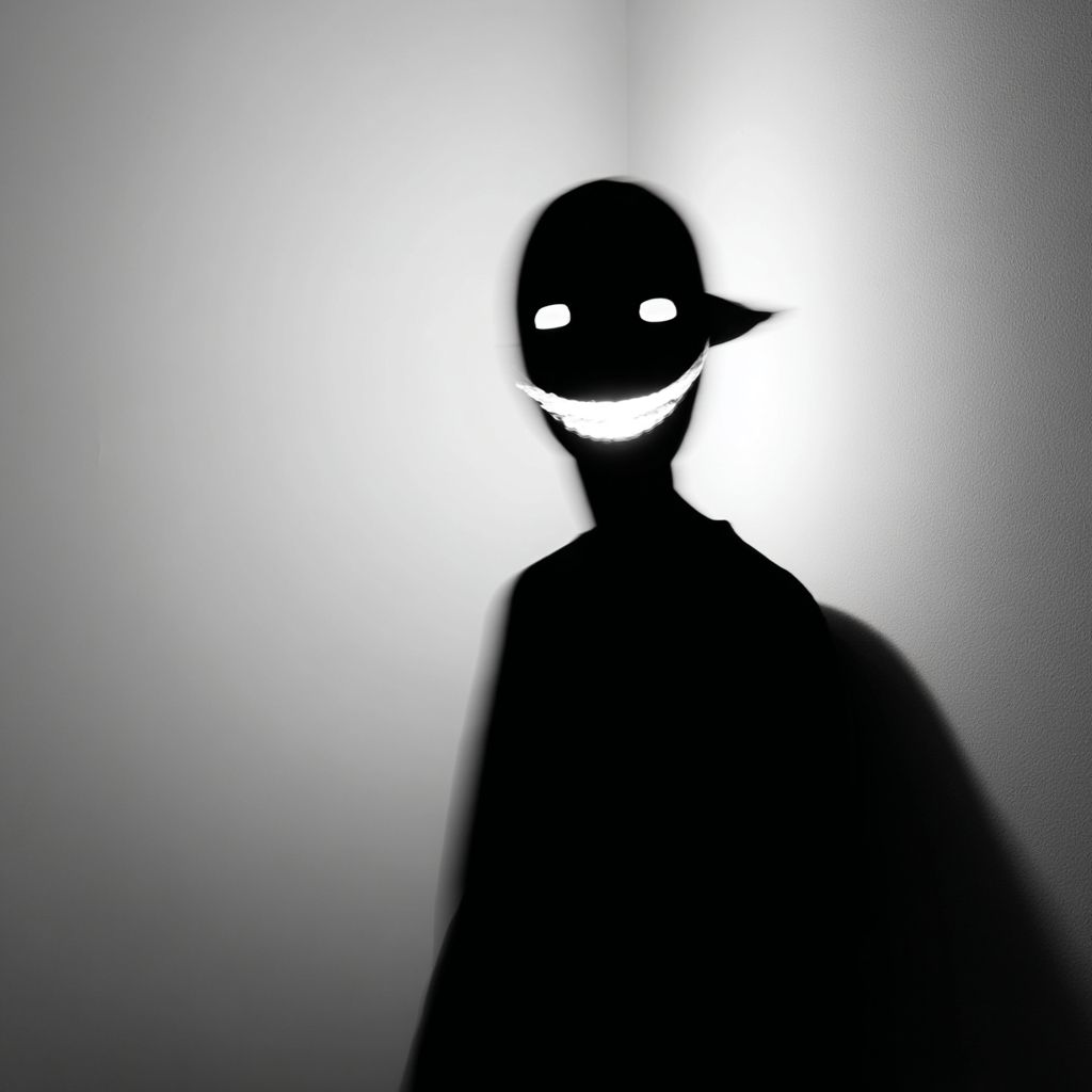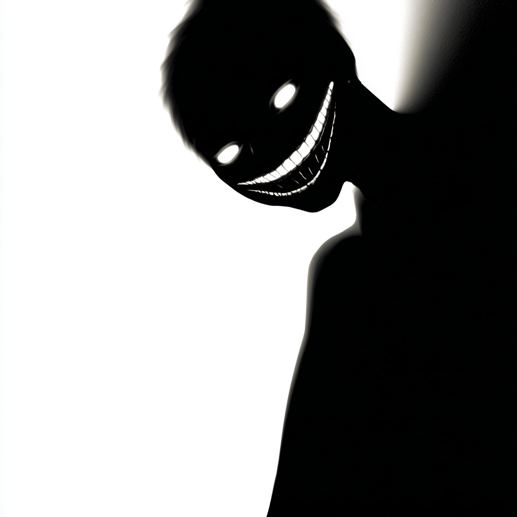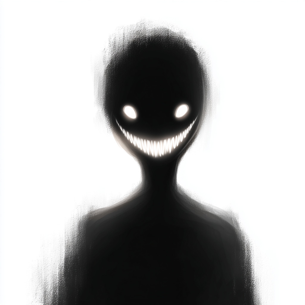 Темный черный силуэт с светящимися белыми глазами и улыбкой