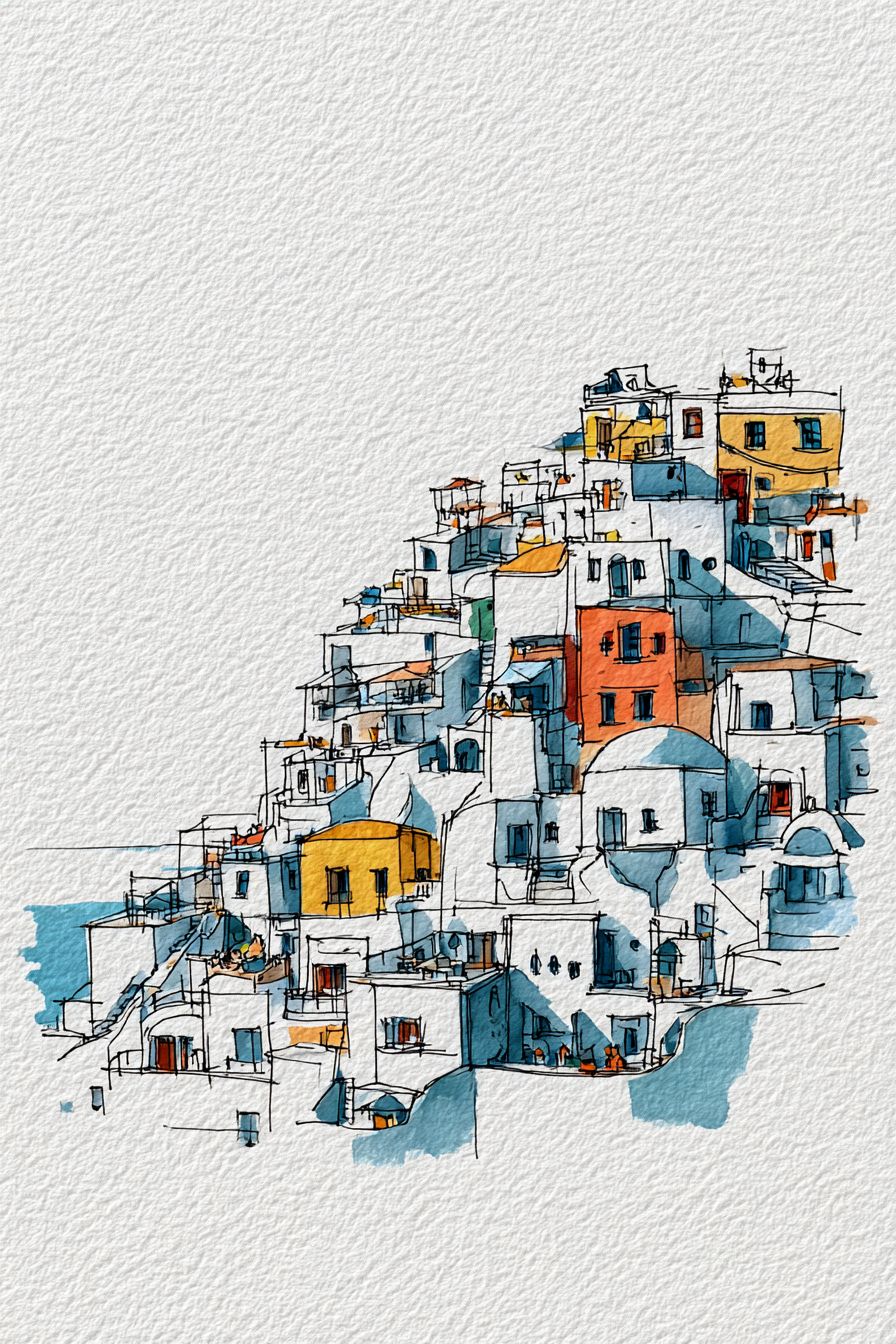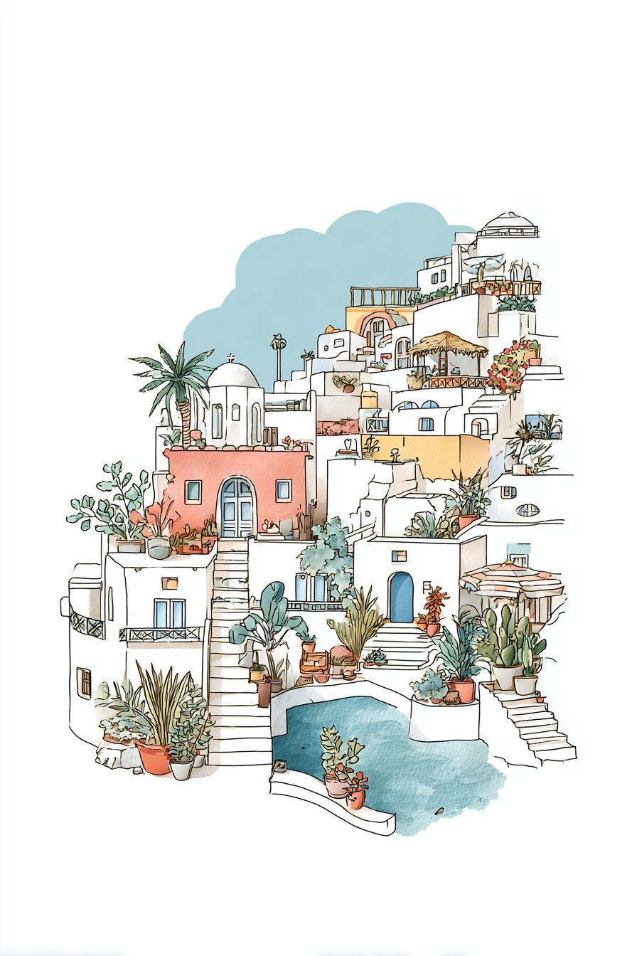Artist Yeoniu Choi style, simple line drawing, cartoon, bold line outlines, hand-drawn illustration, summer, seaside, on a travel journey, healing, healing art style, minimalist, clean, low-saturation colors, rich details, clean background, master composition, holiday, white background, watercolor, Santorini, marker, small illustrations on white paper, no obvious boundaries, atmospheric feel, white blank edges. --v 7.0 --ar 2:3