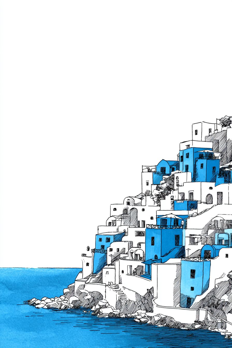 Стиль художника Ёни Чхоя, простое линейное рисование, мультфильм, жирные контуры, иллюстрация ручной работы, лето, побережье, в путешествии, исцеление, стиль исцеления в искусстве, минимализм, чистота, малонасыщенные цвета, богатые детали, чистый фон, мастерская композиция, отпуск, белый фон, акварель, Санторини, маркер, маленькие иллюстрации на белой бумаге, без очевидных границ, атмосферное ощущение, белые пустые края.