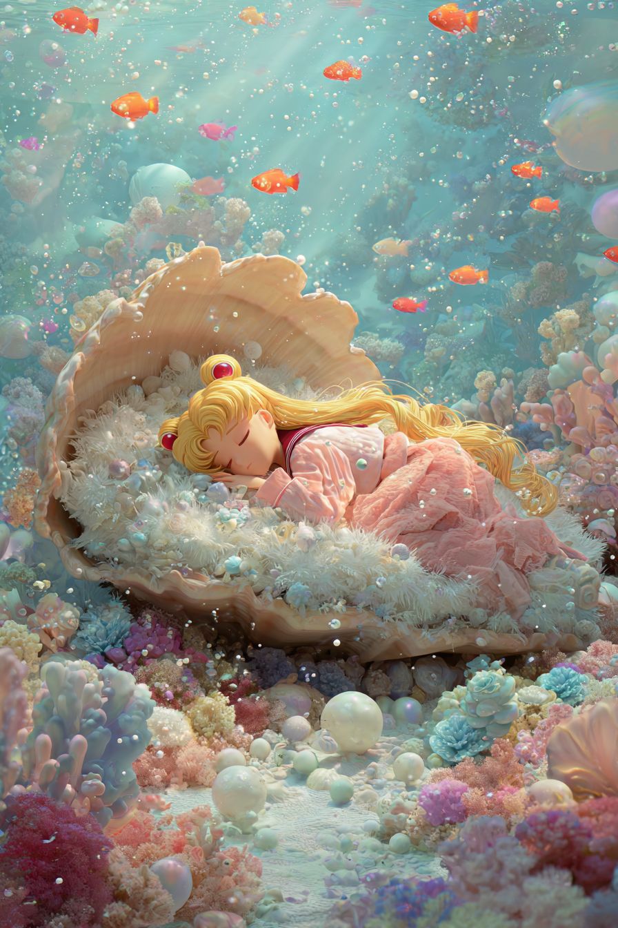 Аниме-стиль, 3D, с деликатными мазками кисти. Сейлор Мун комфортно спит на пушистой длинноволосой раковине, окруженная мягкими, меховыми текстурами, наслаждаясь спокойным сном. Зима под водой, разбросанные пушистые жемчужины и рыбы, плавающие туда-сюда вдали. Сцена милая, воображаемая, с нежными цветами и полуреалистичным художественным прикосновением.