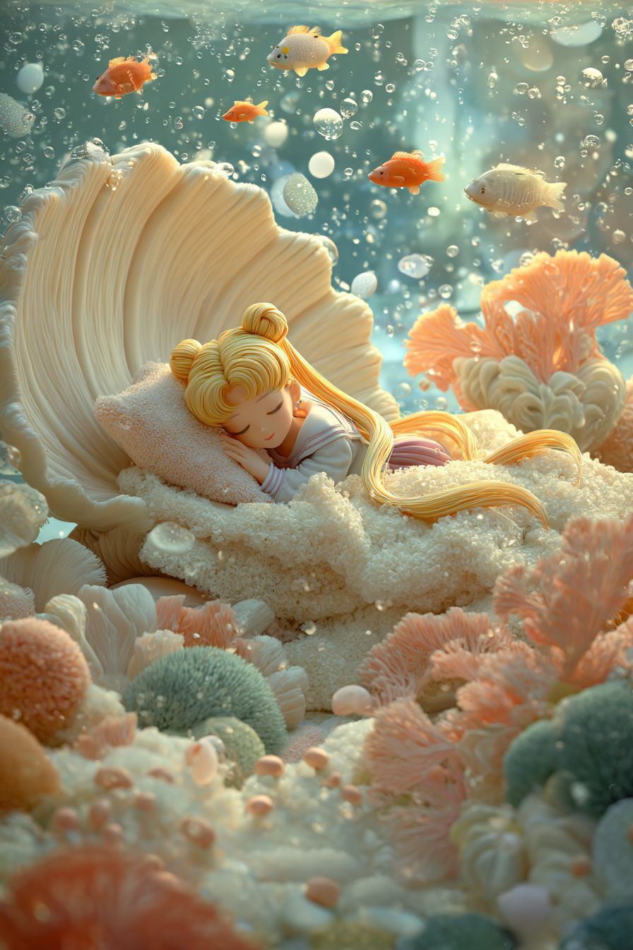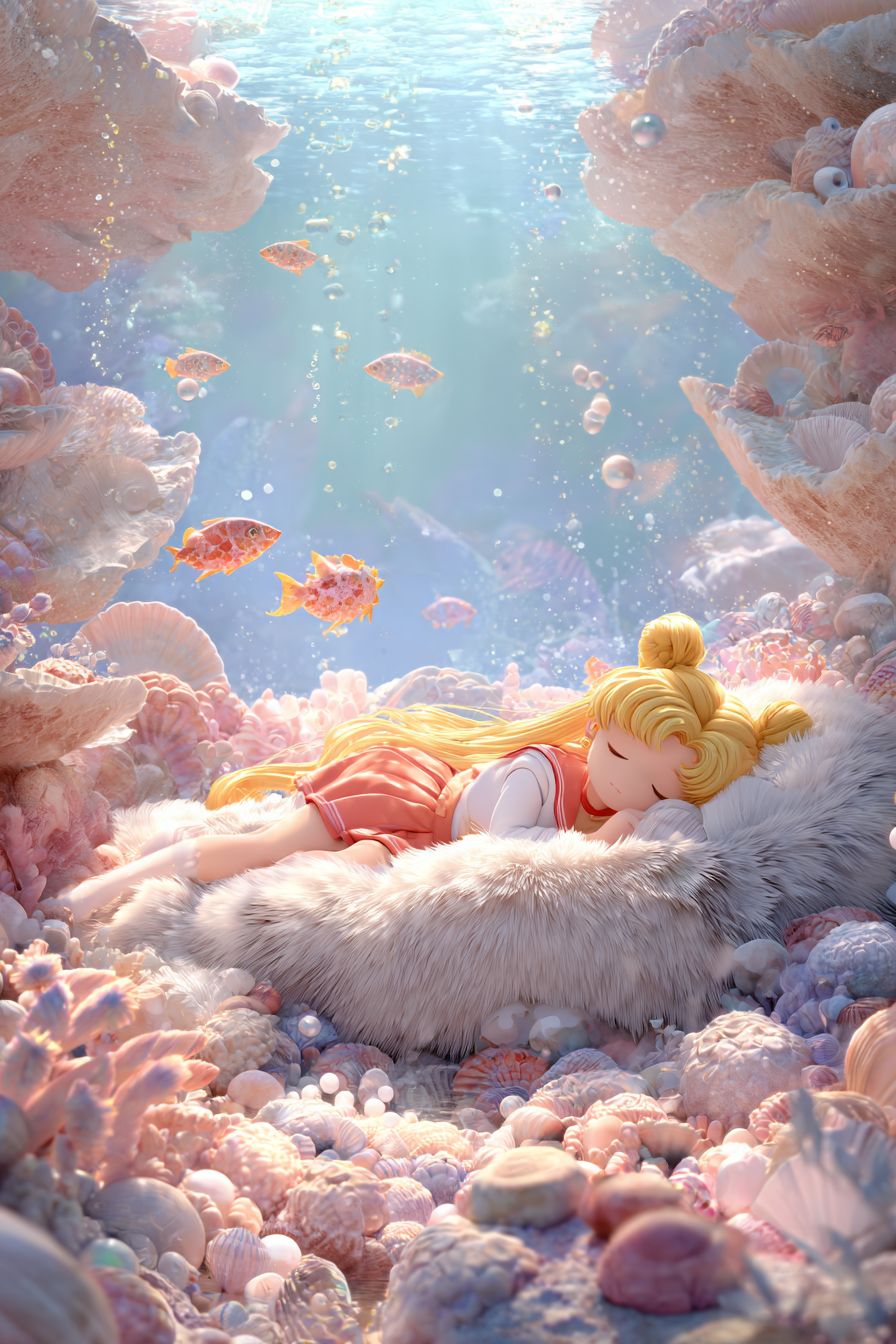 Anime style, 3D, with delicate brushstrokes. Sailor Moon is comfortably sleeping on a fluffy long-haired shell bed, surrounded by soft, furry textures, enjoying a peaceful slumber. It's winter underwater, with scattered fluffy pearls, and fish swimming back and forth in the distance. The scene is cute, imaginative, with gentle colors, and has a semi-realistic artistic touch. --v 7.0 --ar 2:3