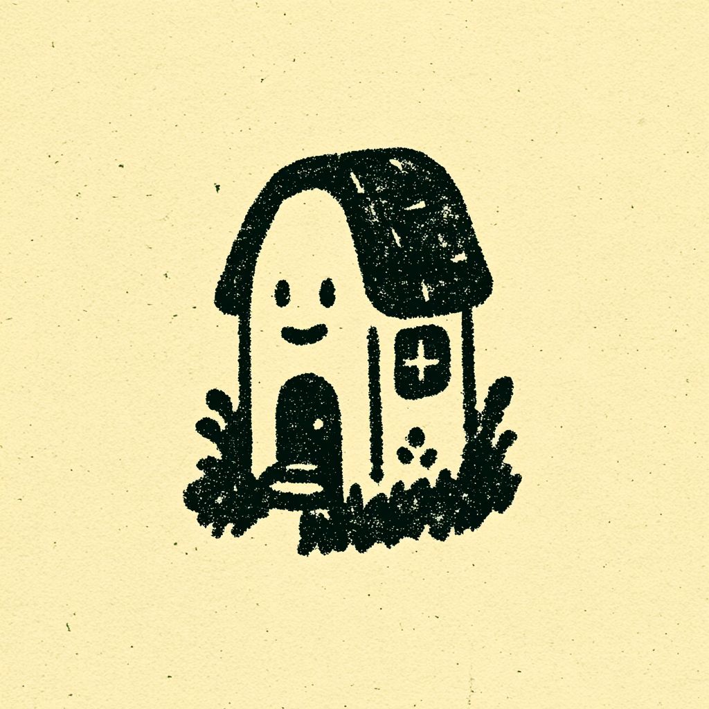 Cute vintage cartoon small apartment logo in 1950s screen print style, Extremely simplified shapes, chibi-like proportions, thick outline, no facial detail beyond dots and curve lines, one-color ink design. Perfect for retro T-shirt print. Off-white background. --ar 1:1 --raw --profile vg7y6ad --v 7.0