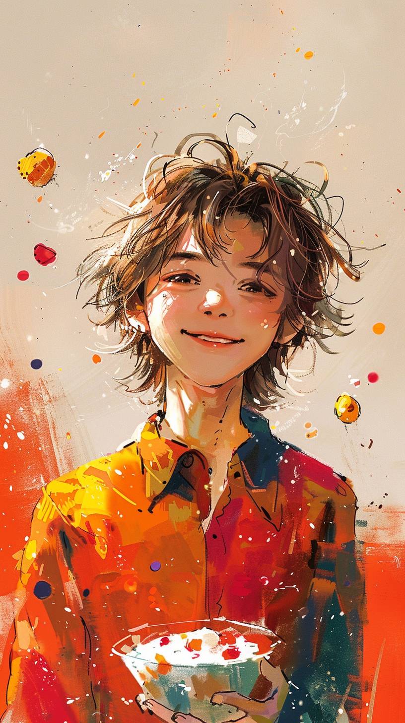 Beautiful young man, fluffy brown hair, cute blouse, eating pudding, background pop wallpaper,high quality, amount of drawing, pixiv illustration --ar 9:16 --style raw --sref 2324324301 --stylize 500 --v 6.0