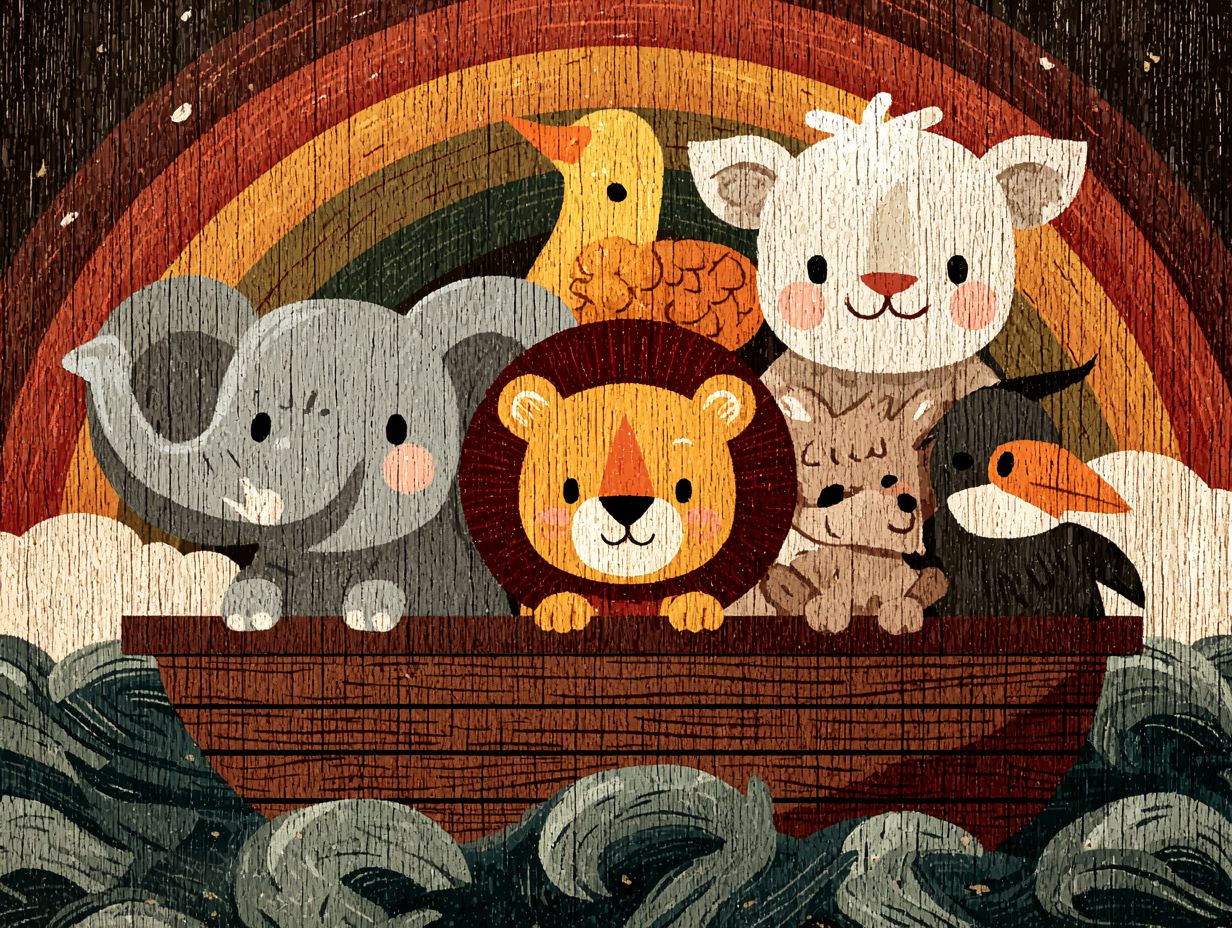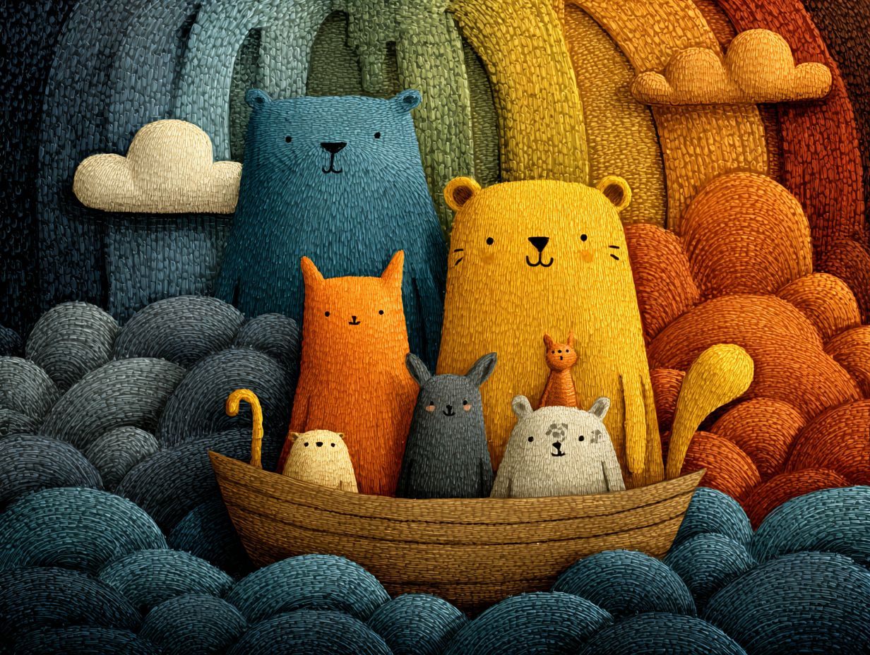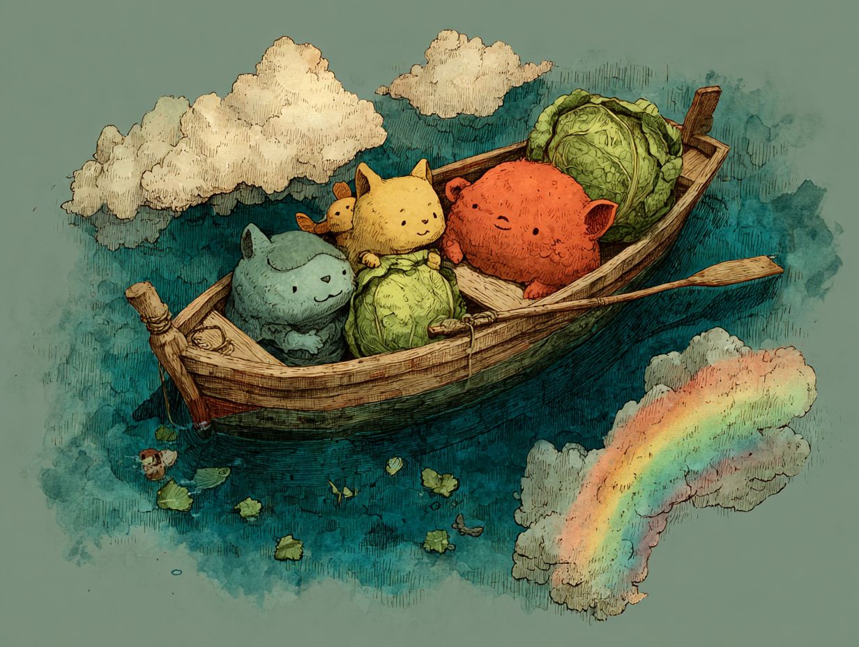 A delightful children's illustration featuring a small wooden boat carrying cute animals across a cloudy expanse with a lovely rainbow above. --chaos 30 --ar 4:3 --stylize 250 --v 7.0