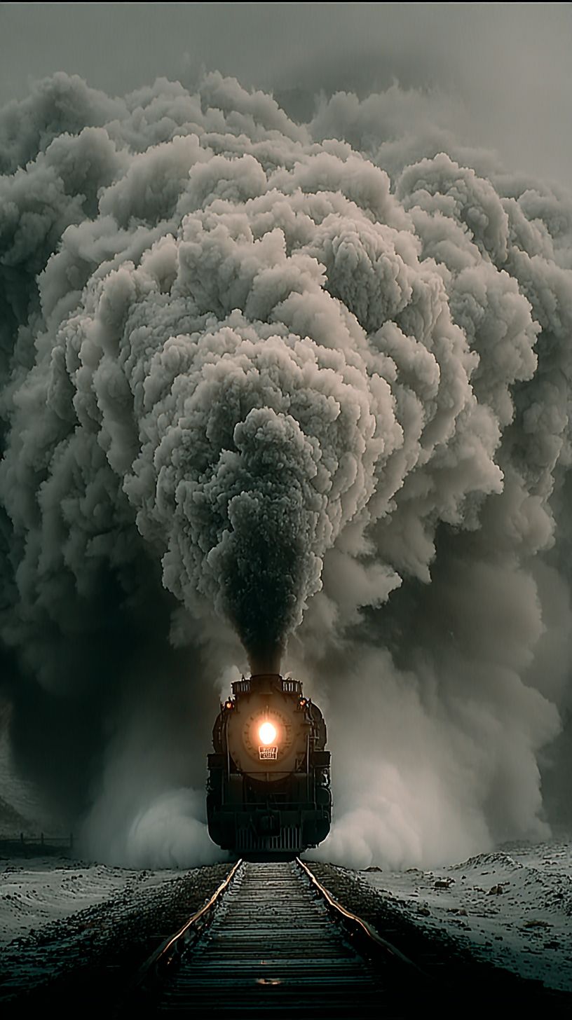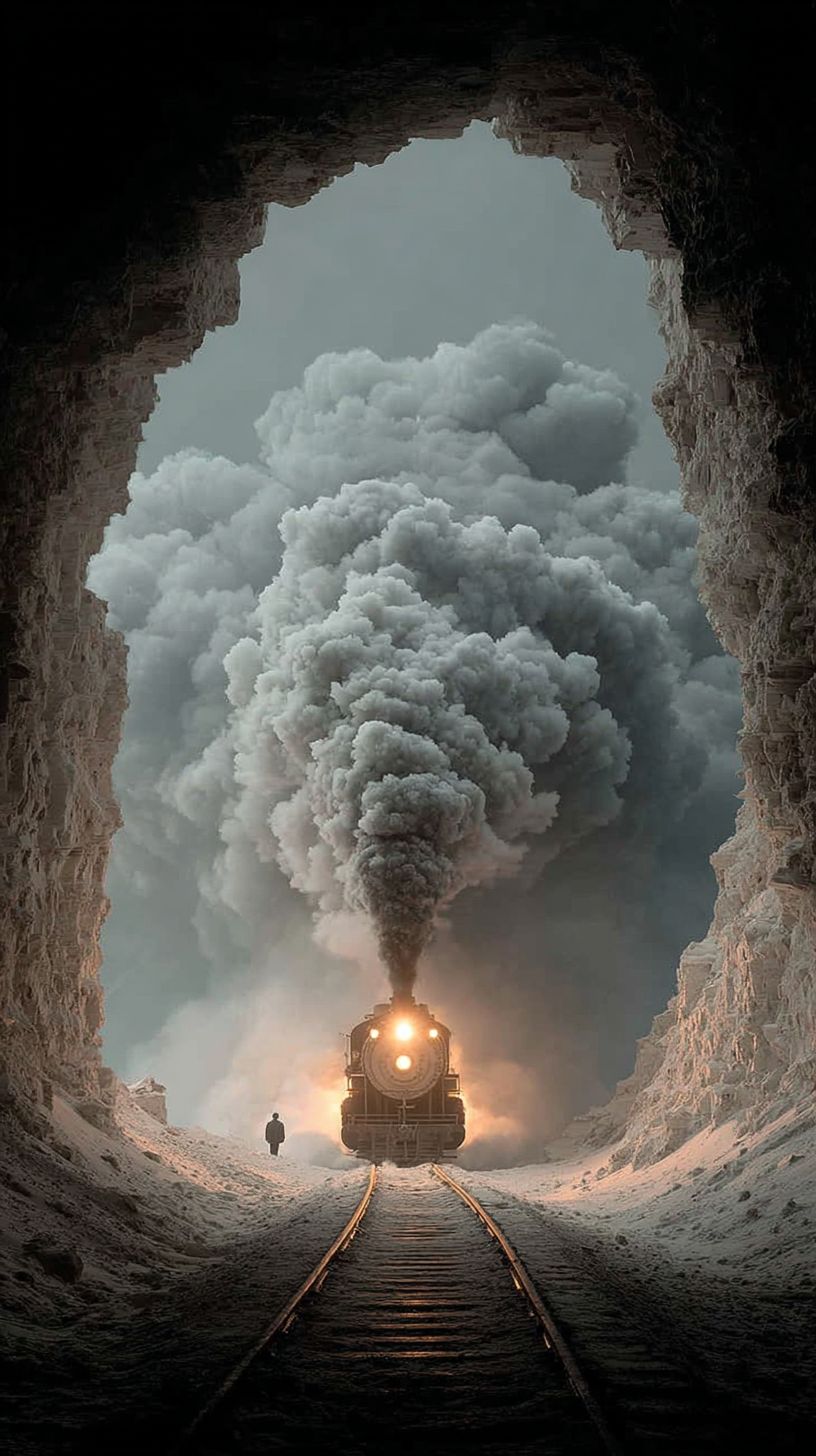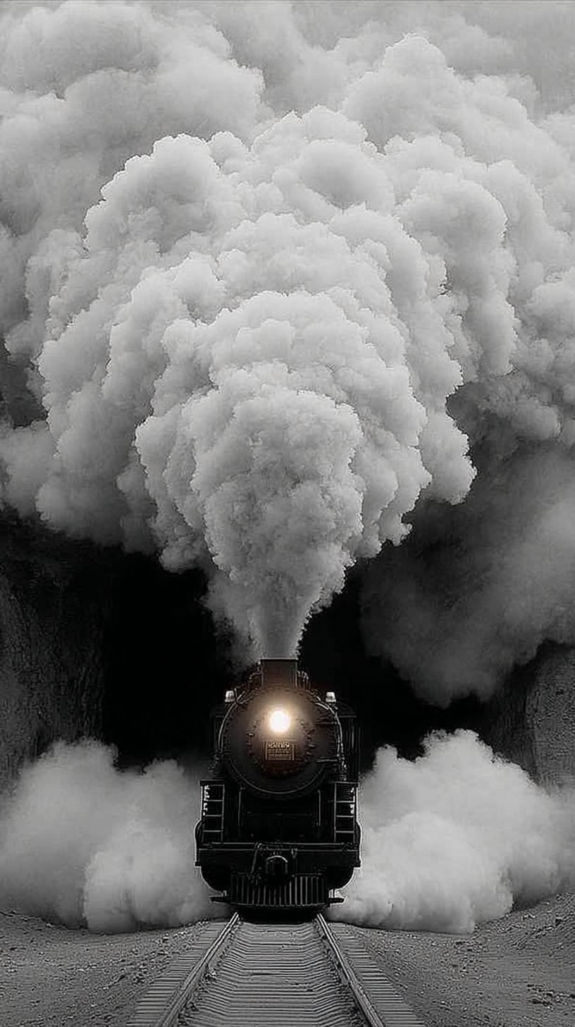Это кадр из романтического фильма 2001 года 'Предназначение' режиссера Майкла Кристофера. Снято с нижнего ракурса, на нем изображен огромный паровоз, который спереди заходит в черную пещеру, с белым дымом на фоне чистого черного цвета, в реалистично живом стиле с замысловатыми и тщательными деталями.