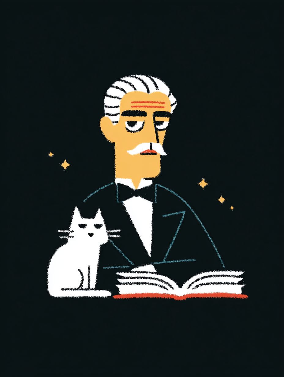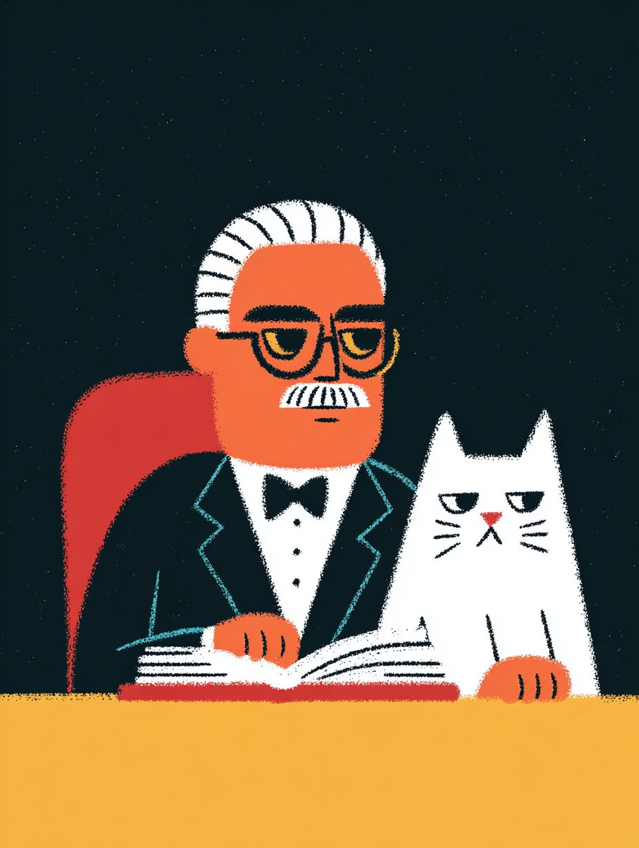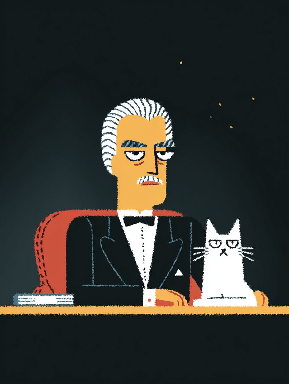 Illustration [Don Vito Corleone in a dimly lit office, sitting behind a desk stroking a cat, wearing a black suit, golden hour lighting, vintage 1940s atmosphere.] --ar 3:4 --exp 80 --sref 3908994546 --profile 29poq4o --s 750 --raw