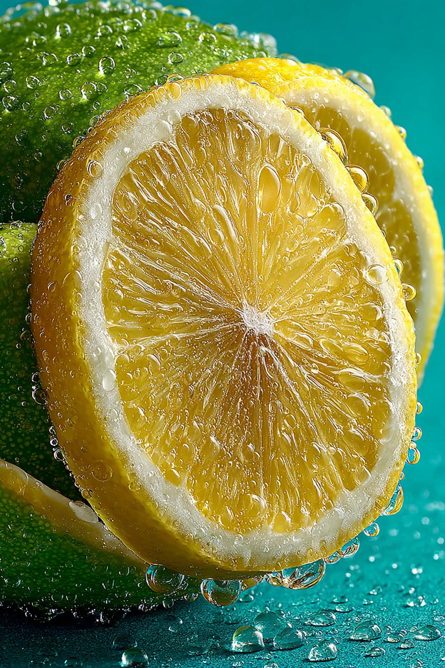 Изображения высокого разрешения, макроперспектива, крупная фотография со студийным освещением, свет и тень, ломтики лимона, полупрозрачность, светло-зеленый фон, четкая текстура, крупный план. Ultra HD 16k. Кристально чистый, рекламный блокбастер, идеальная композиция. Ломтики, полупрозрачные, композиция из нескольких ломтиков лимона, многолюдно.
